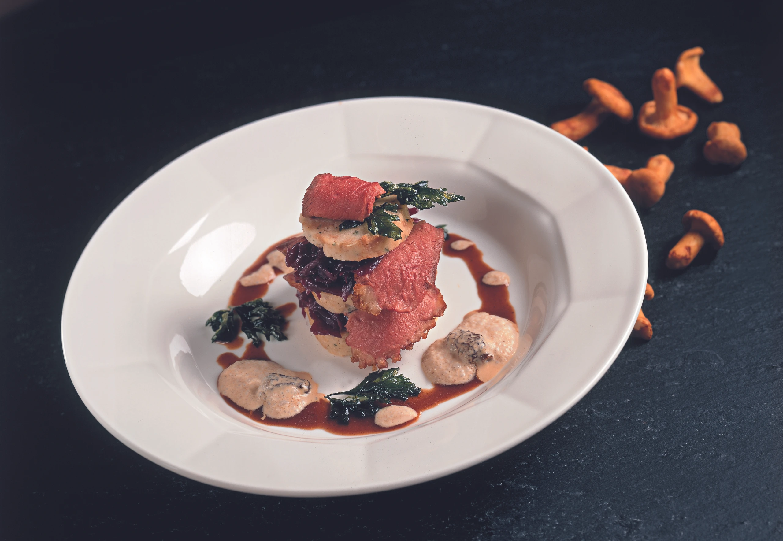 Entenbrust mit Pilz-Serviettenknöderln und Apfel-Rotkraut