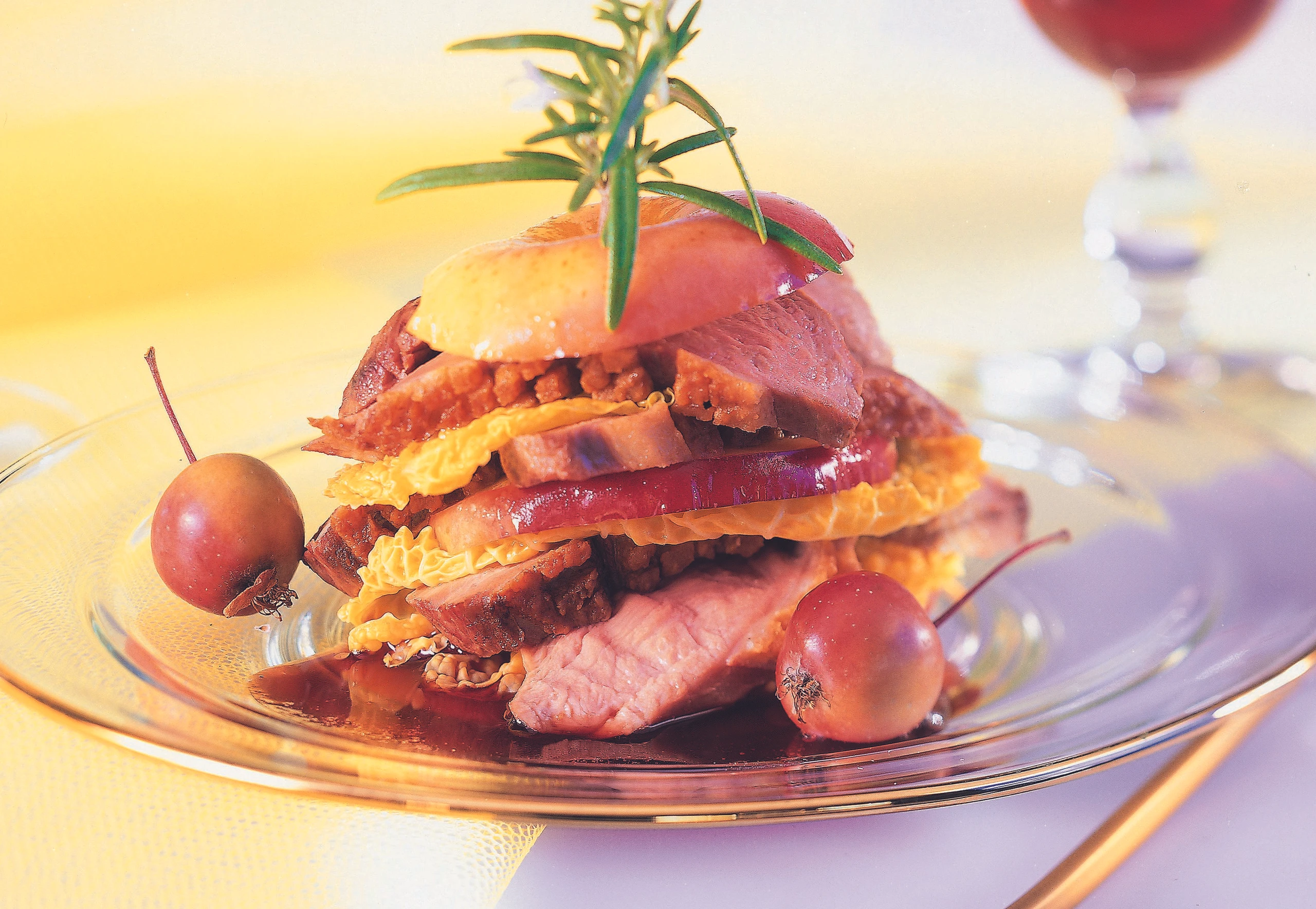 - Teller wärmen, auf jedem eine Apfelscheibe anrichten, ein Kohlblatt sowie eine Entenbrustscheibe darauf legen. Die übrigen Zutaten in beliebiger Reihenfolge übereinander legen. Türmchen mit der Sauce und den Rosmarinzweigen garniert servieren.