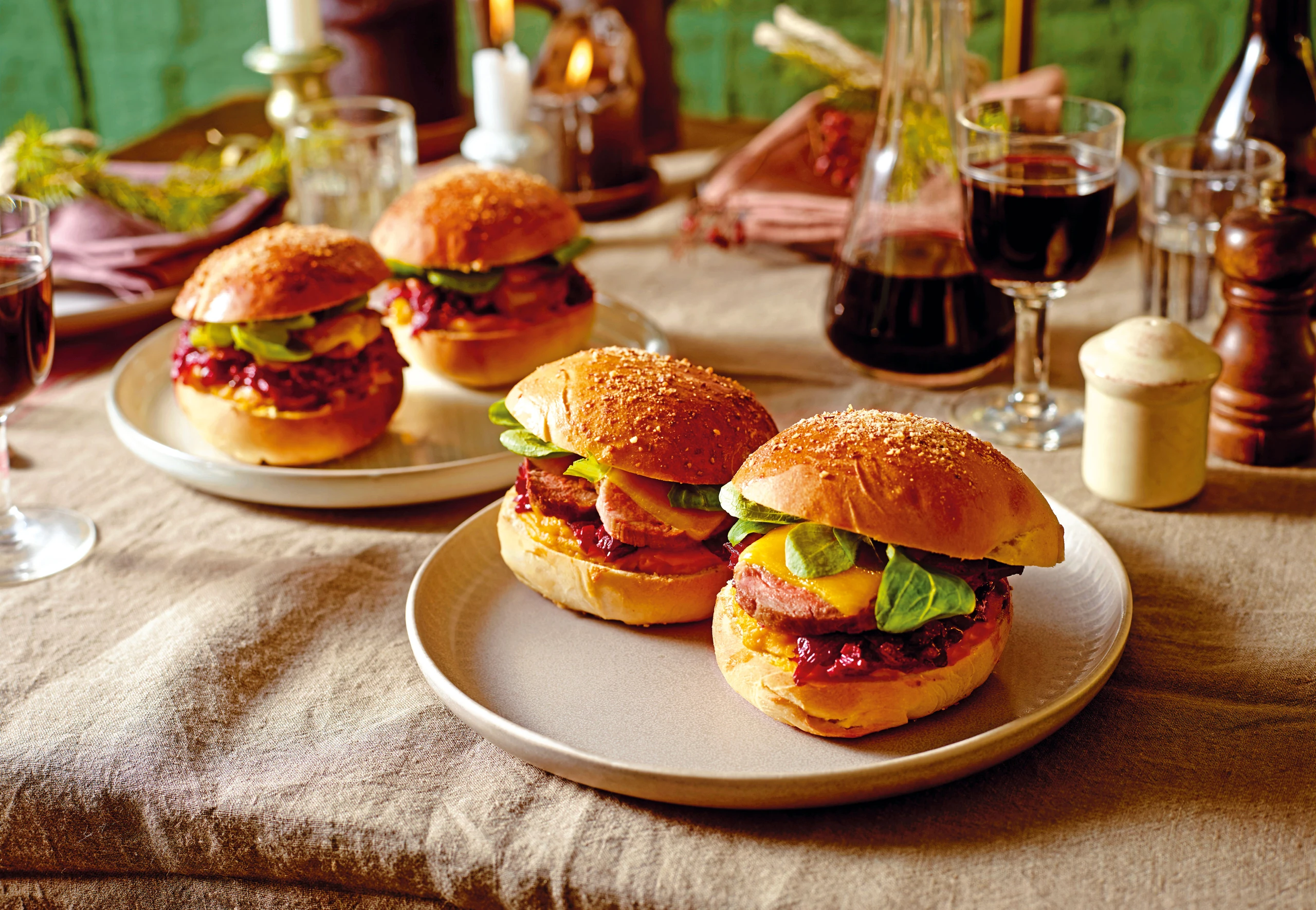 Buns durchschneiden. Böden mit Zwiebeln, Brust und Cheddar belegen. Cheddar im Rohr (mittlere Schiene / Gitterrost) kurz schmelzen lassen. Herausnehmen, mit Salat belegen und den Deckel darauf setzen. Burger rasch servieren.