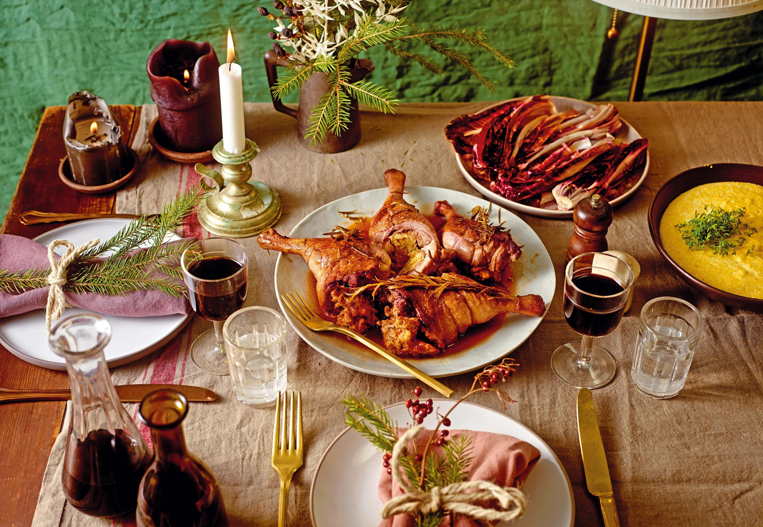 Auf jede Keule ein Viertel von der Fülle geben und im Fleisch einschlagen. Keulen mit Spagat binden, salzen, pfeffern, in 4 EL vom Öl rundum anbraten und aus der Pfanne nehmen. Im Bratrückstand Schalotten anschwitzen und mit Fond aufgießen. Keulen, Thymian und Rosmarin zugeben und bei schwacher Hitze ca. 45 Minuten dünsten.