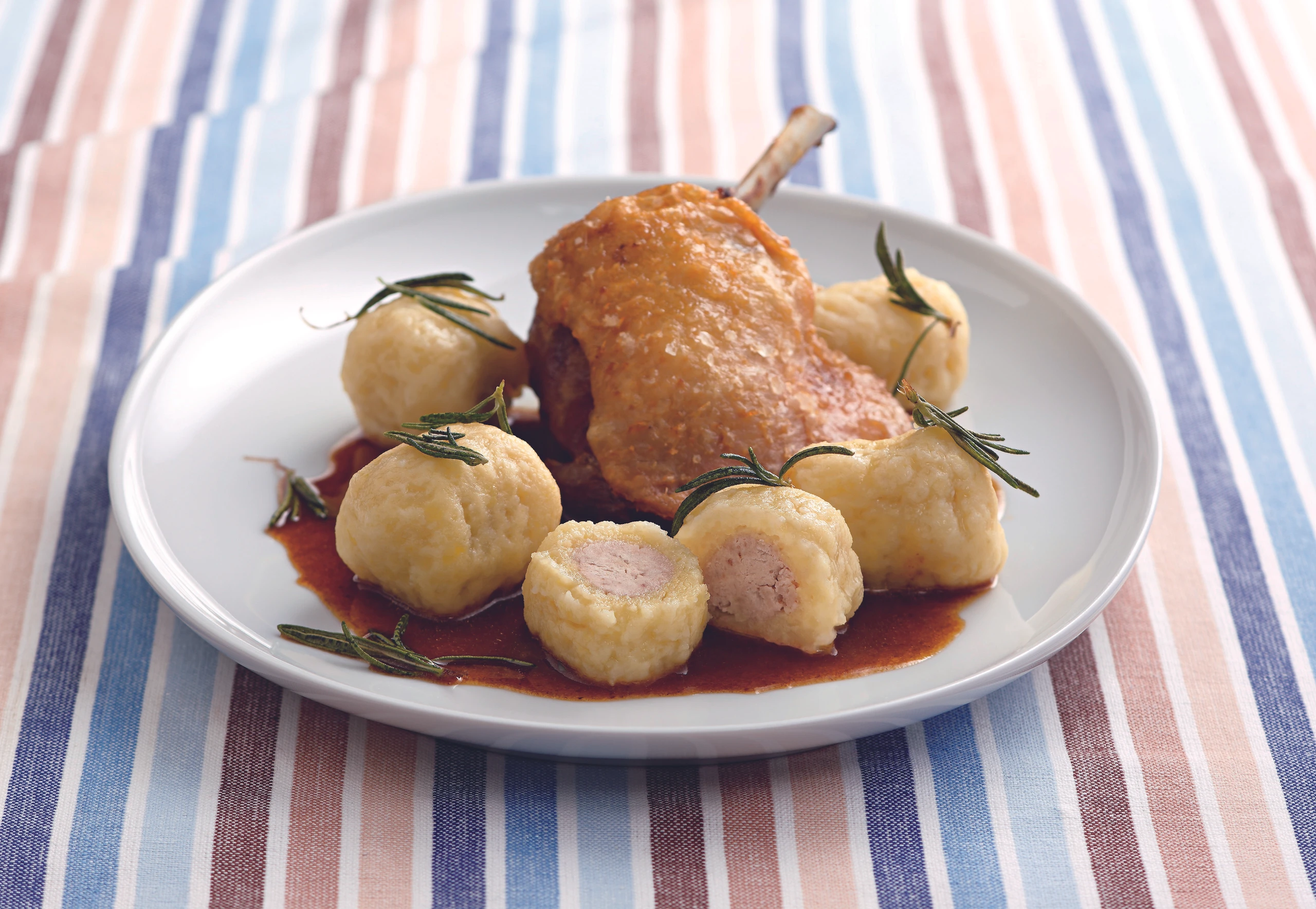 Erdäpfel weich kochen, schälen, passieren, mit Dottern, Mehl und Salz zu einem glatten Teig verrühren. Aus der Masse 12 Bällchen formen, in die Mitte eine Vertiefung drücken, Kastanienkugeln hineindrücken, mit Teig umhüllen und zu Gnocchi formen.