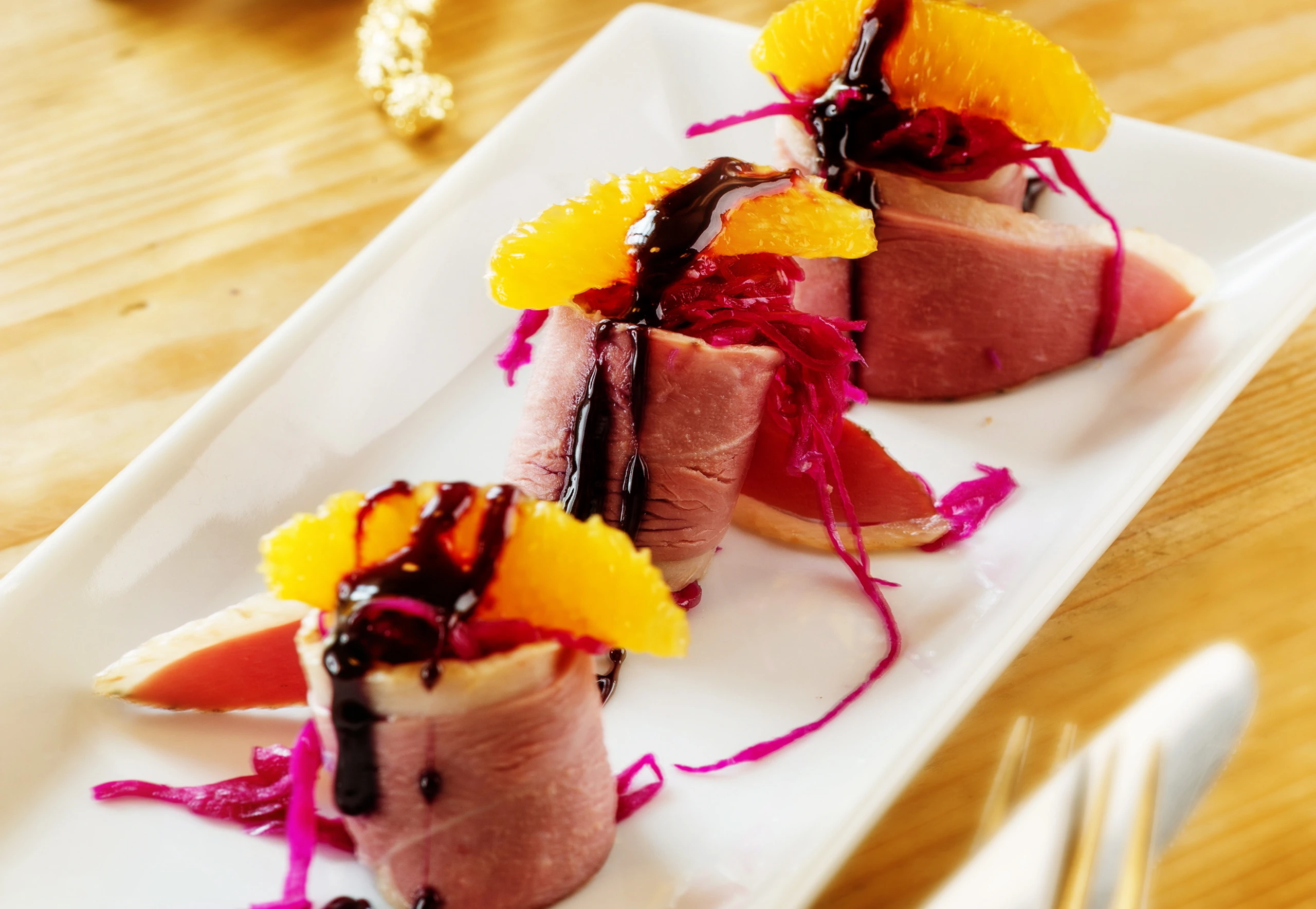 - Für die Sauce Marinade auf ca. 2 EL einkochen und vom Herd nehmen. Je 3 Röllchen auf Tellern anrichten und mit Orangenfilets und der Sauce garniert servieren.