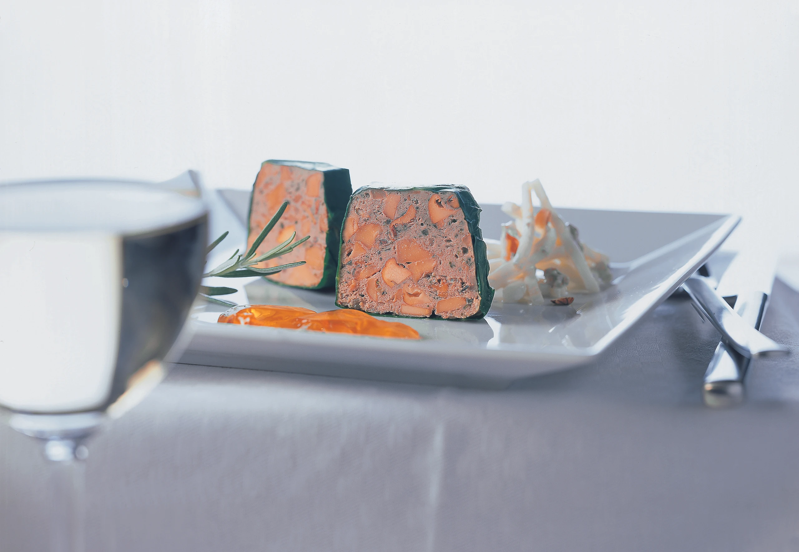 Terrine aus dem Wasserbad nehmen, bei Zimmertemperatur auskühlen lassen und für ca. 7 Stunden in den Kühlschrank stellen.