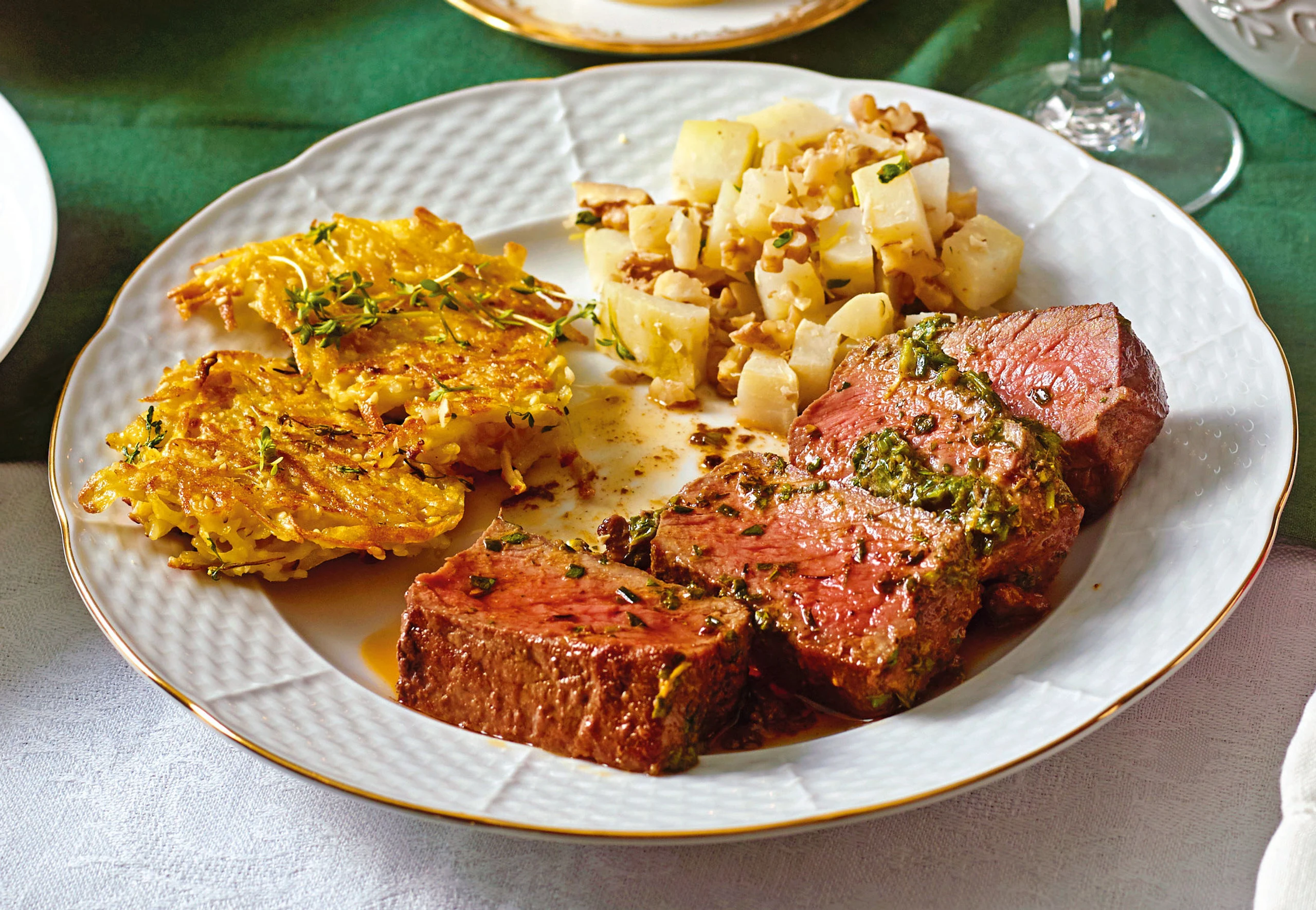 Entrecôte double mit Kräuterbutter, Rösti und Nuss-Kohlrabi