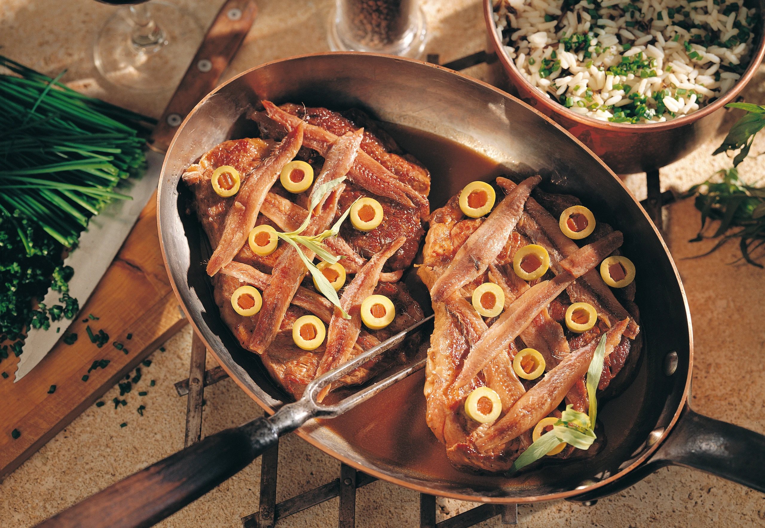 Entrecôte Mirabeau – Rib-Eye-Steak mit Sardellen und Oliven