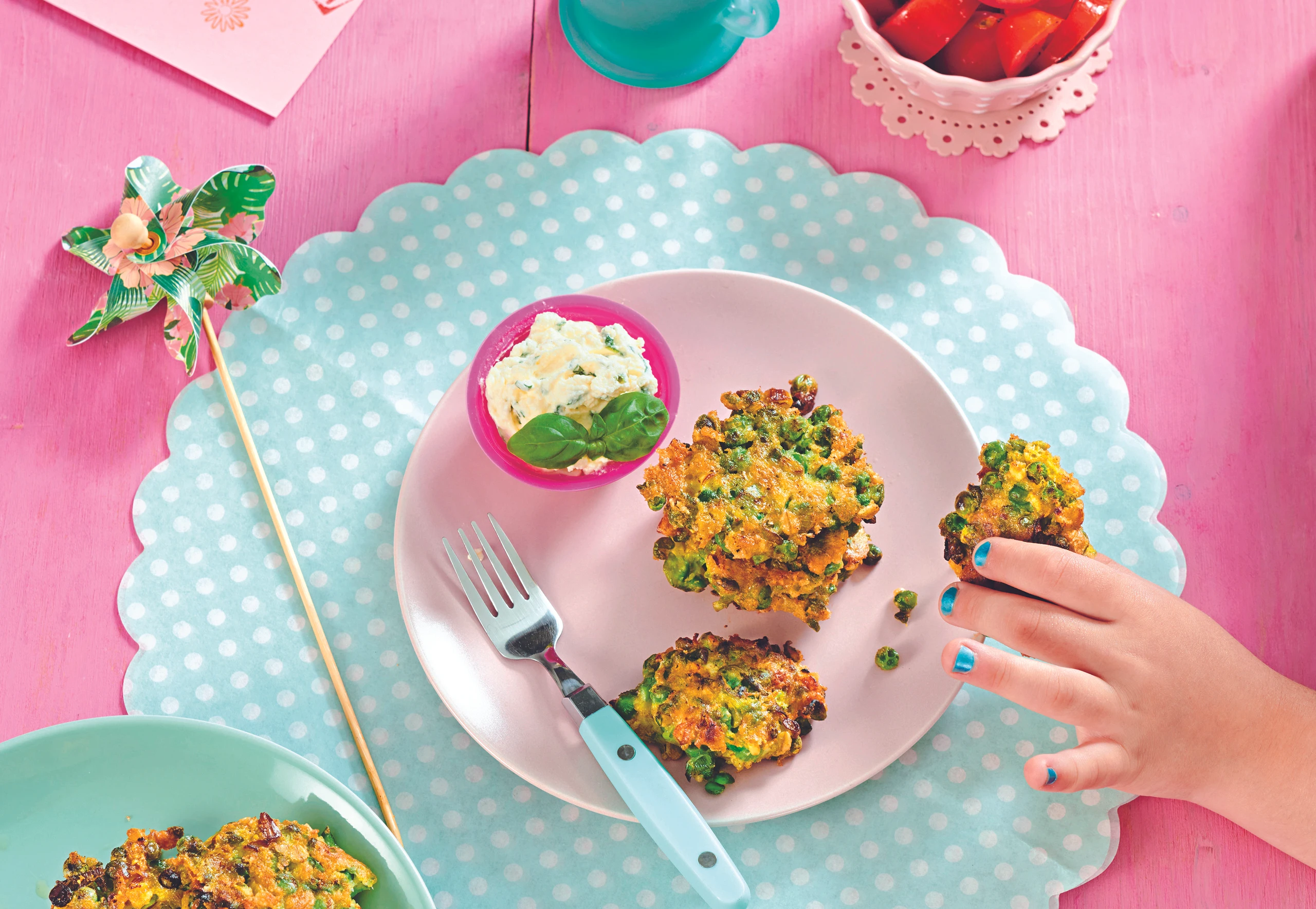 Erbsen-Fritter mit Bergkäse und Basilikum-Dip