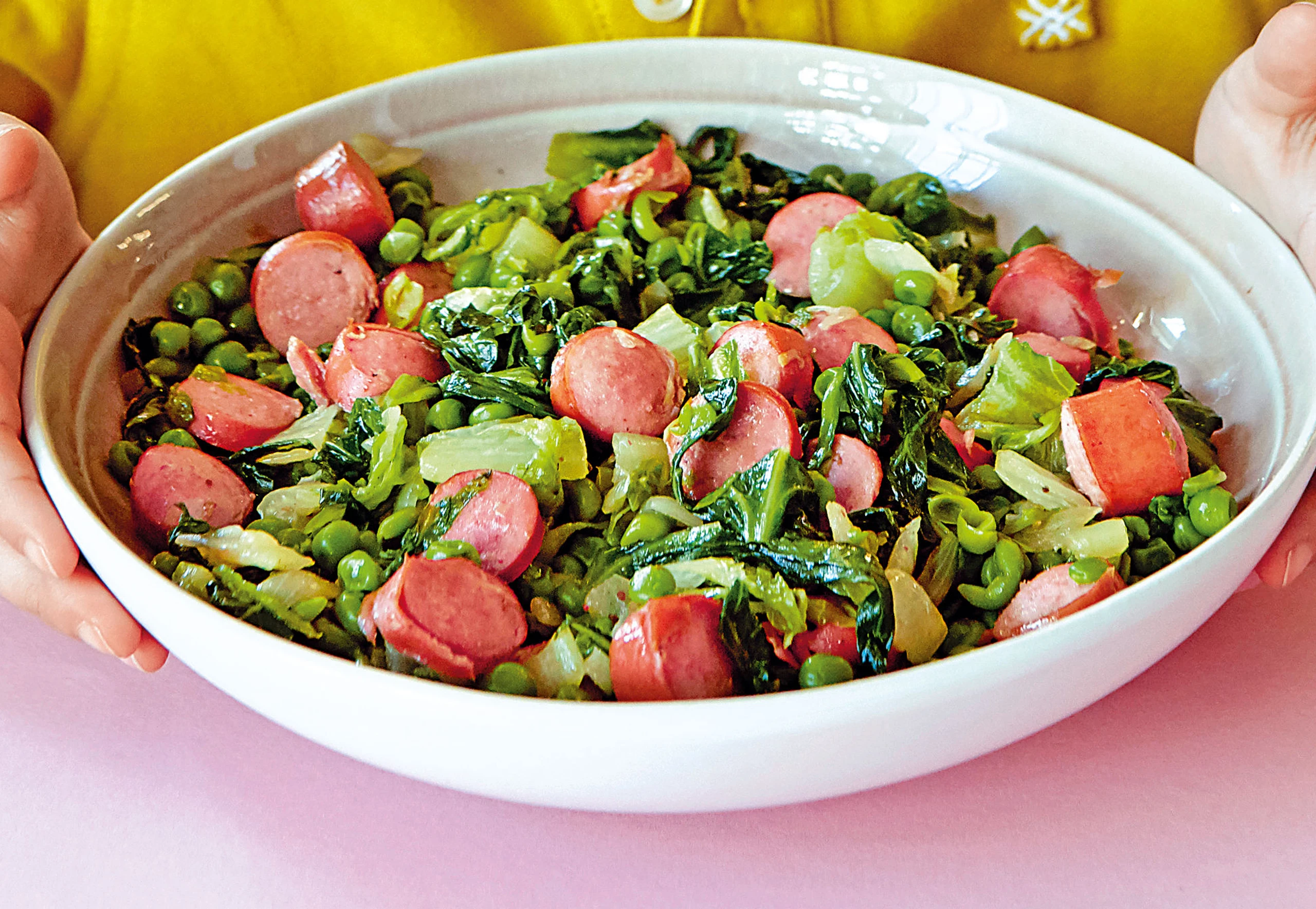 Erbsen und Salat zugeben und ca. 15 Minuten köcheln, dabei immer wieder umrühren.