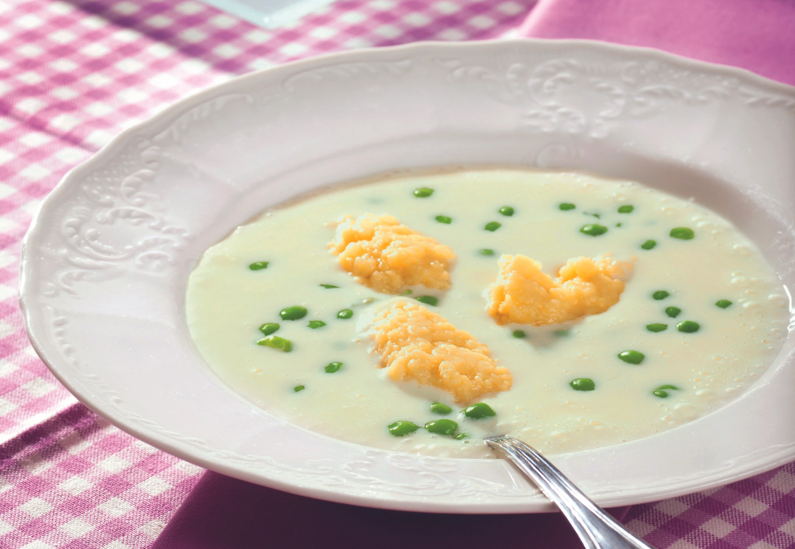 Inzwischen für die Suppe Zwiebel schälen, klein schneiden und in Butter anschwitzen. Mehl einrühren, kurz mitrösten und mit Suppe aufgießen. Suppe aufkochen, ca. 200 g von den Erbsen zugeben und ca. 10 Minuten köcheln. Obers zugießen, Petersilie einrühren, Suppe fein pürieren. Übrige Erbsen zugeben.