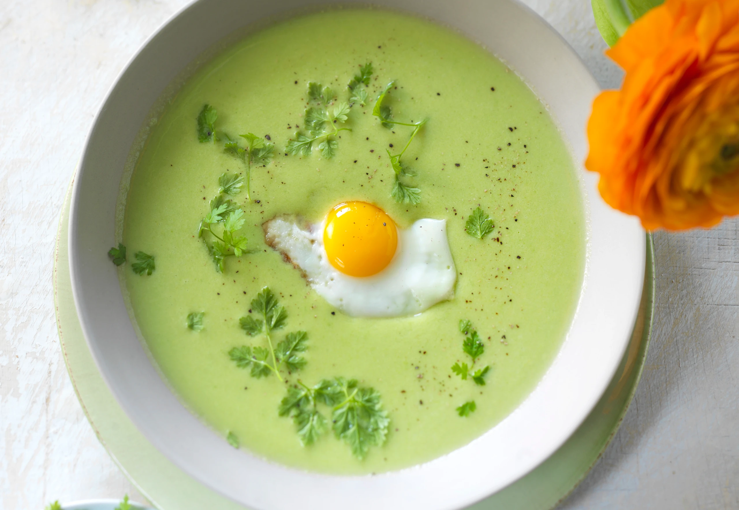 Suppe portionsweise mit je einem Wachtelei anrichten, mit gezupftem Kerbel garnieren.