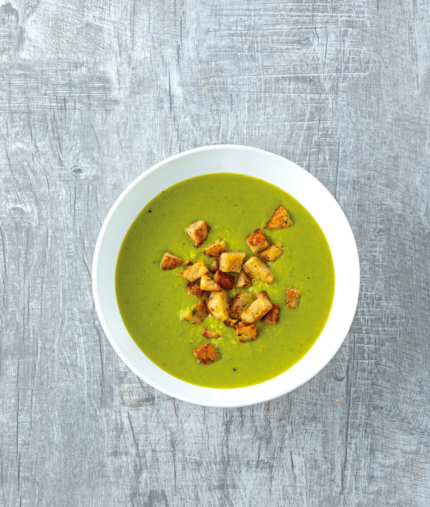 Jungzwiebeln putzen und in feine Ringe schneiden. 3 EL vom Öl in einem Topf erhitzen und die Zwiebeln darin glasig dünsten. Erbsen zugeben und kurz mitdünsten. Suppe und Obers zugeben und zugedeckt ca. 5 Minuten köcheln. Zitronenschale, -saft und Chiliflocken untermischen. Suppe mit dem Stabmixer pürieren.