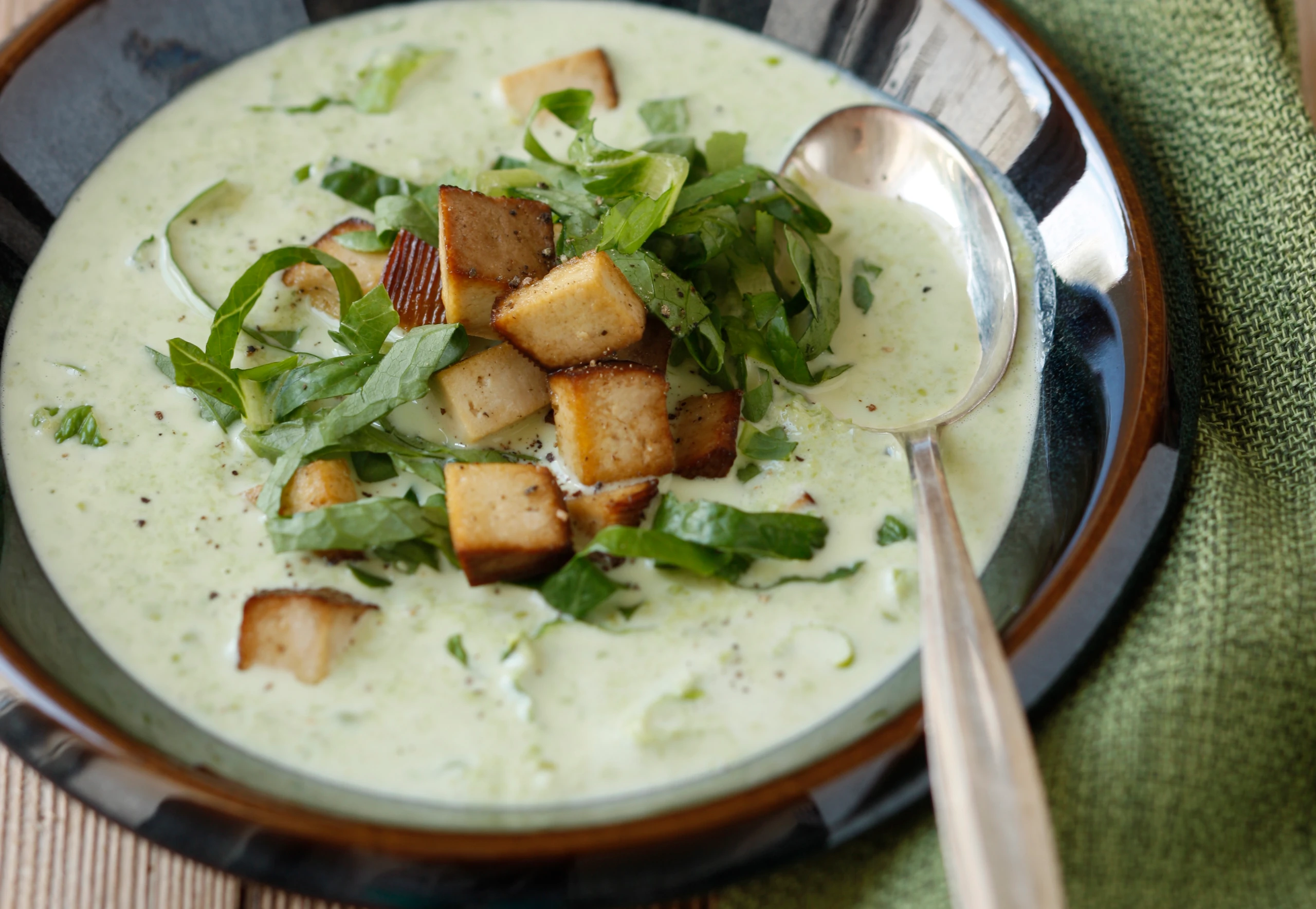 Suppe pürieren, mit Salz, Pfeffer und Zitronensaft würzen, mit Tofu und Kochsalat anrichten.