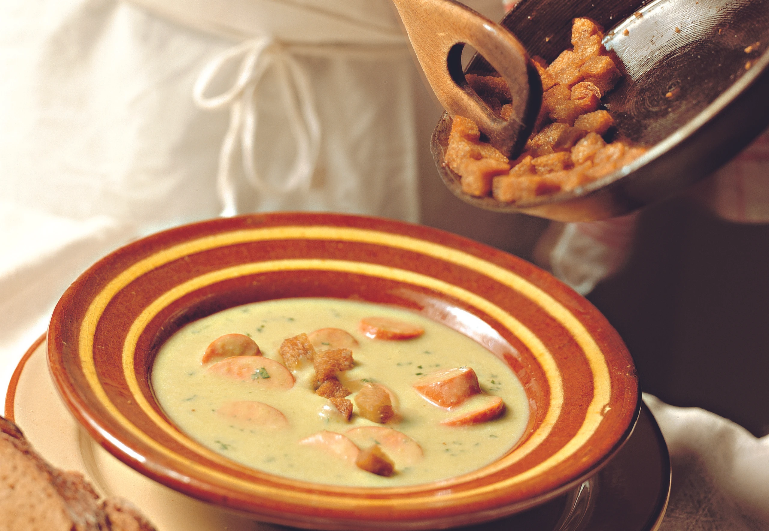- Suppe mit einem Stabmixer pürieren, durch ein feines Sieb gießen und mit Salz, Pfeffer und abgeriebener Muskatnuß würzen. Würstel und Kräuter zugeben, Suppe nochmals aufkochen, in Teller schöpfen und mit Brotwürfeln bestreut servieren.