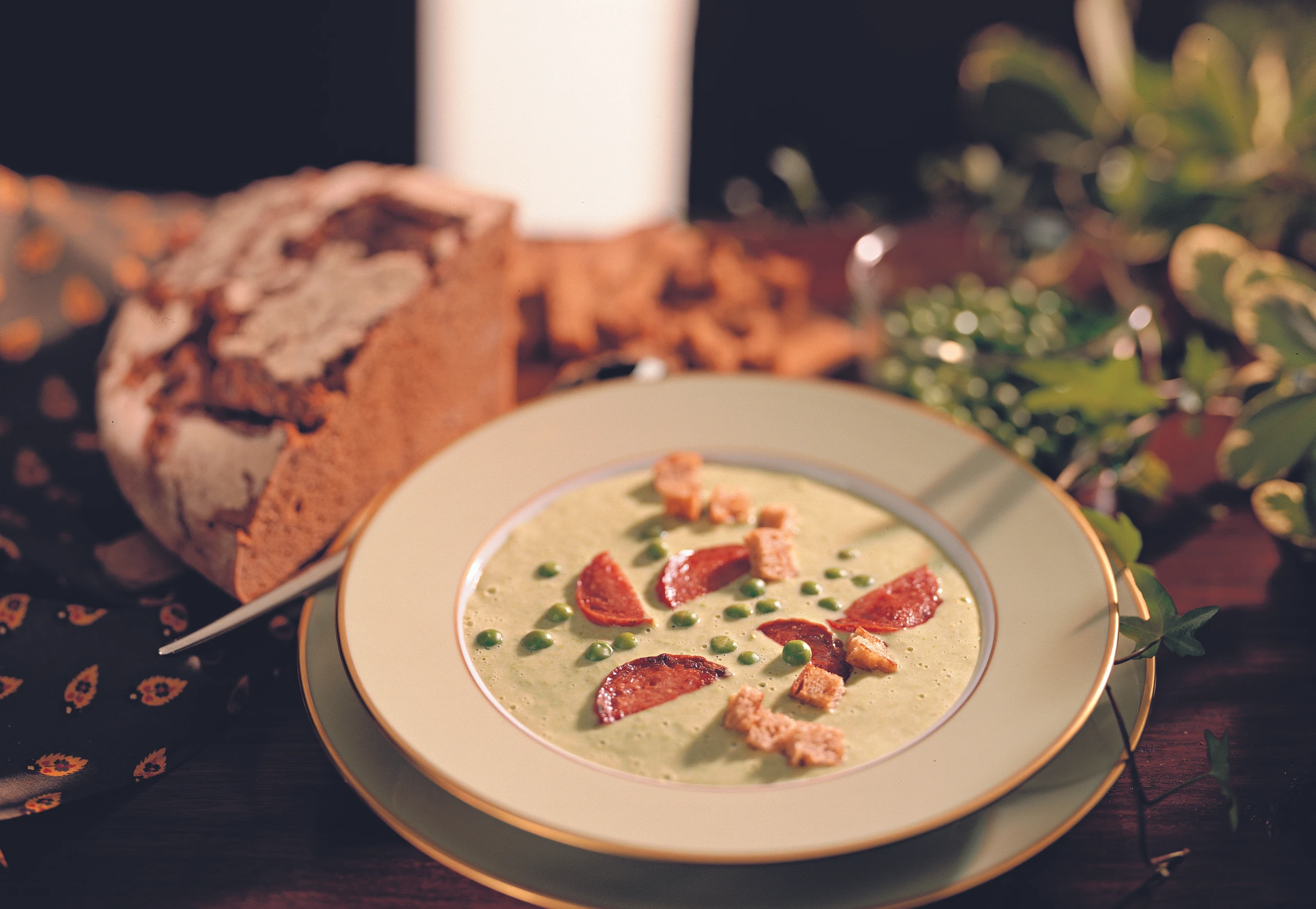 - Suppe mit einem Stabmixer pürieren, mit Salz, Pfeffer und Muskatnuß würzen. Restliche Erbsen und Wurst zugeben, Suppe nochmals erhitzen, in Teller schöpfen und mit Brotwürfeln bestreut servieren.