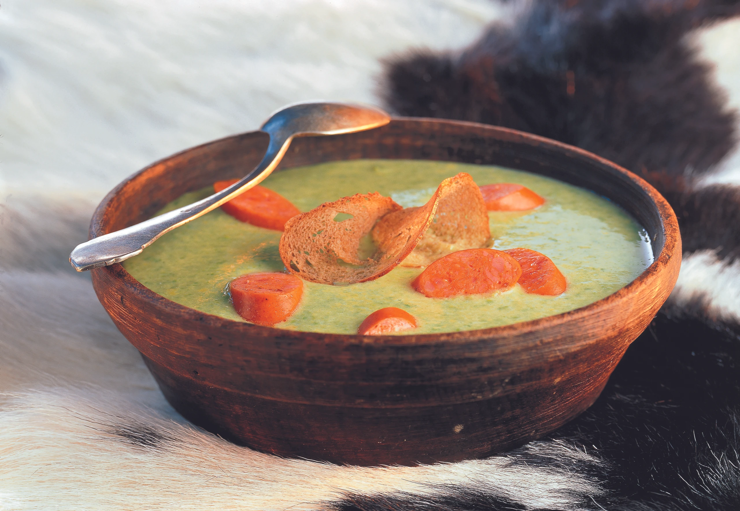 Inzwischen Zwiebel schälen, klein würfelig schneiden und mit den Erbsen in Butter anschwitzen, Mehl einrühren und kurz mitrösten. Ansatz mit Suppe und Milch aufgießen und ca. 12 Minuten köcheln.