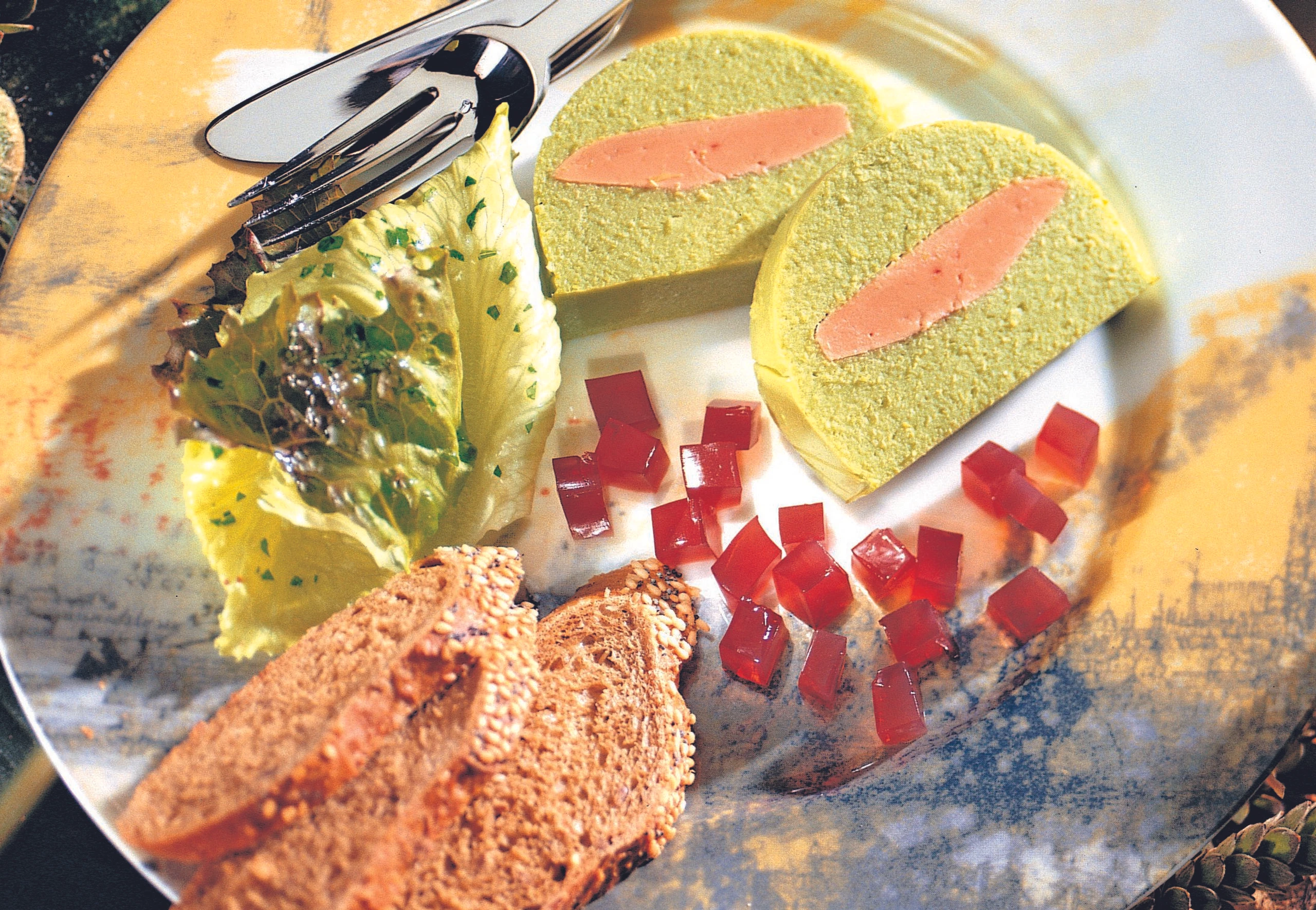 Gelatine in kaltem Wasser einweichen, gut ausdrücken und in der noch warmen Erbsenmasse auflösen. Die Hälfte der Masse in die Terrinenform füllen, die Gänseleber darauf verteilen und mit dem restlichen Erbsenmus gleichmäßig bedecken. Terrine mit Frischhaltefolie zudecken und zum Festwerden mindestens 5 Stunden kühlen.