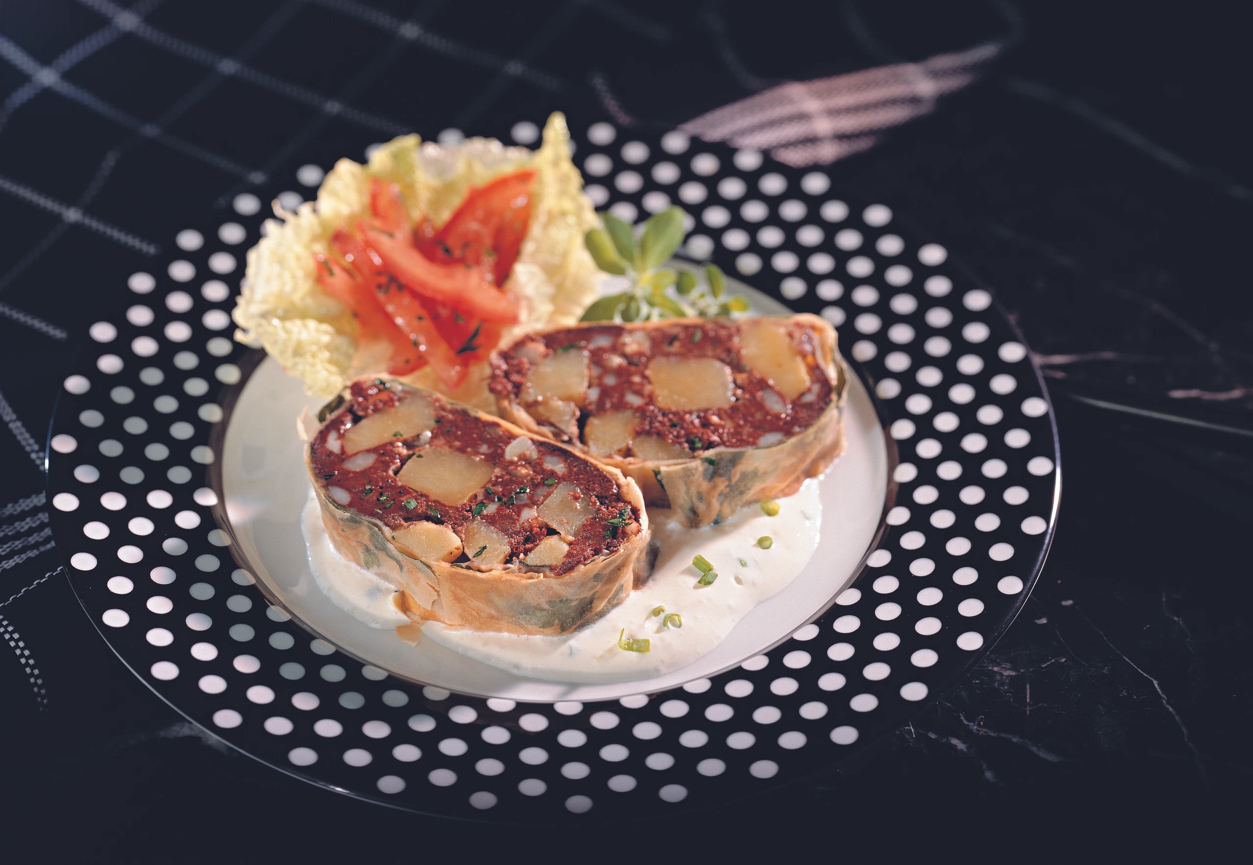 Erdäpfel-Blunzenstrudel mit Kräuter-Knoblauchsauce