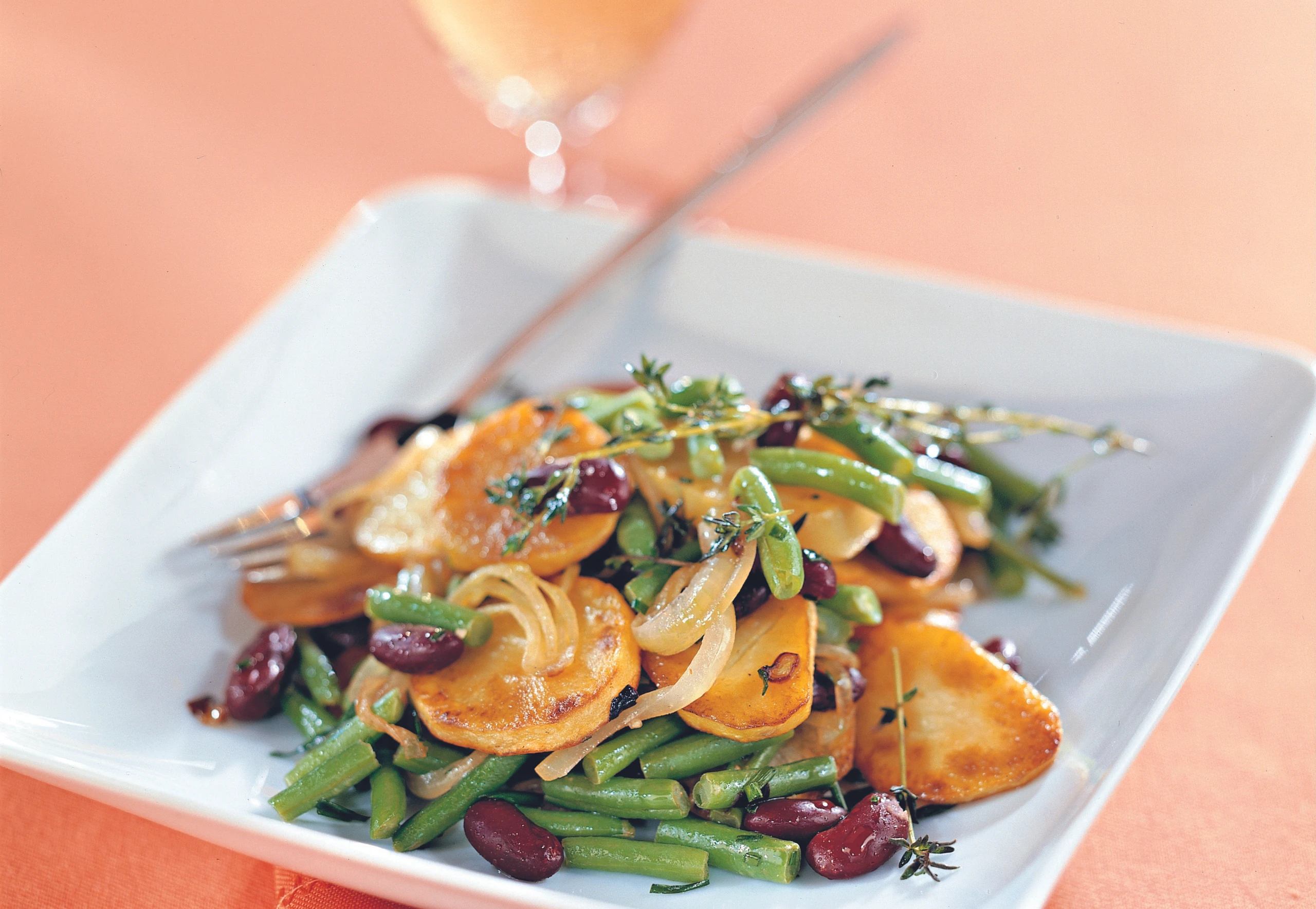 Im Bratrückstand Fisolen, Bohnen und Zwiebel in Butter anschwitzen, mit Salz, Pfeffer und zerdrücktem Knoblauch würzen. Erdäpfel und Thymian untermischen.