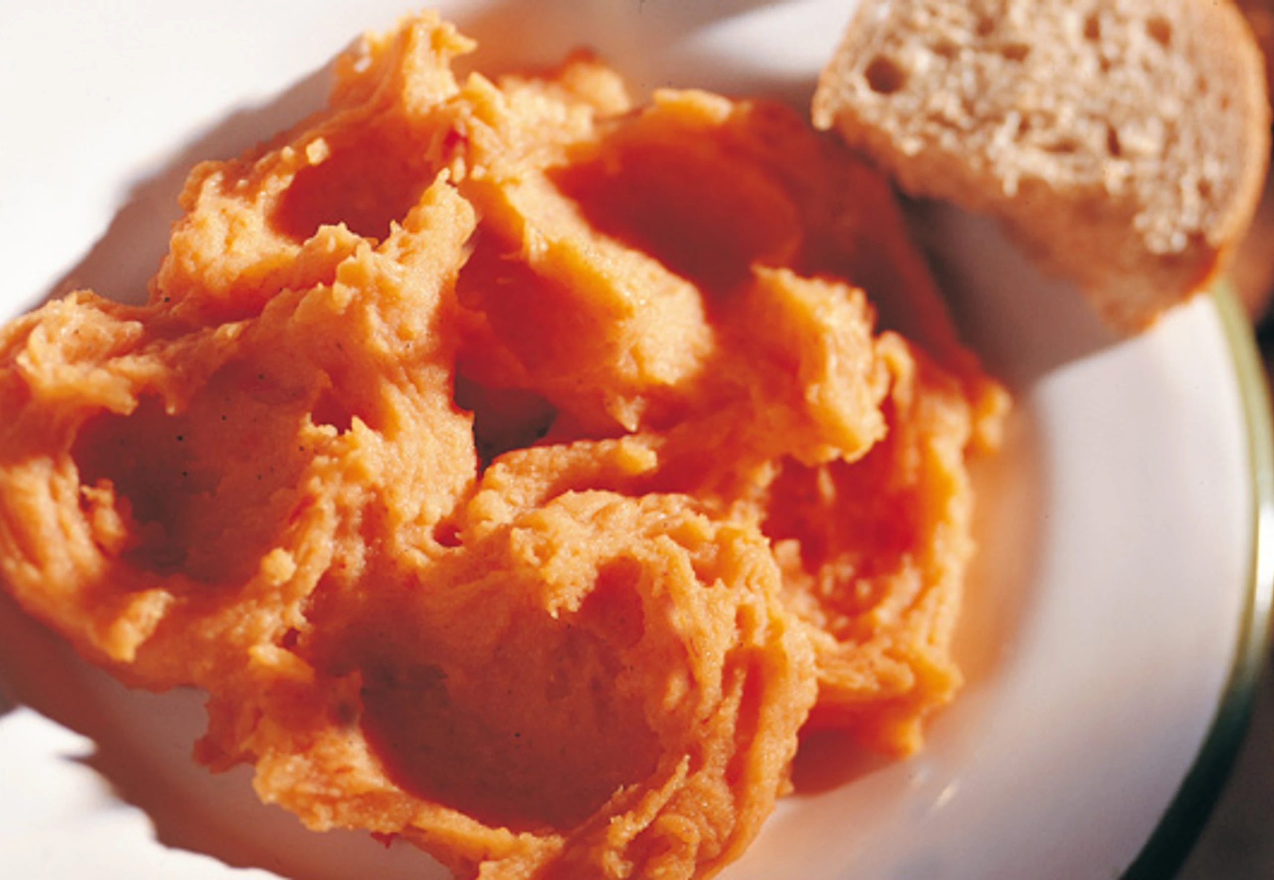 - Erdäpfel- und Paprikapüree, Knoblauch, 2 EL Essig sowie 3 EL Olivenöl mit dem Handmixer zu einer glatten Masse verrühren.