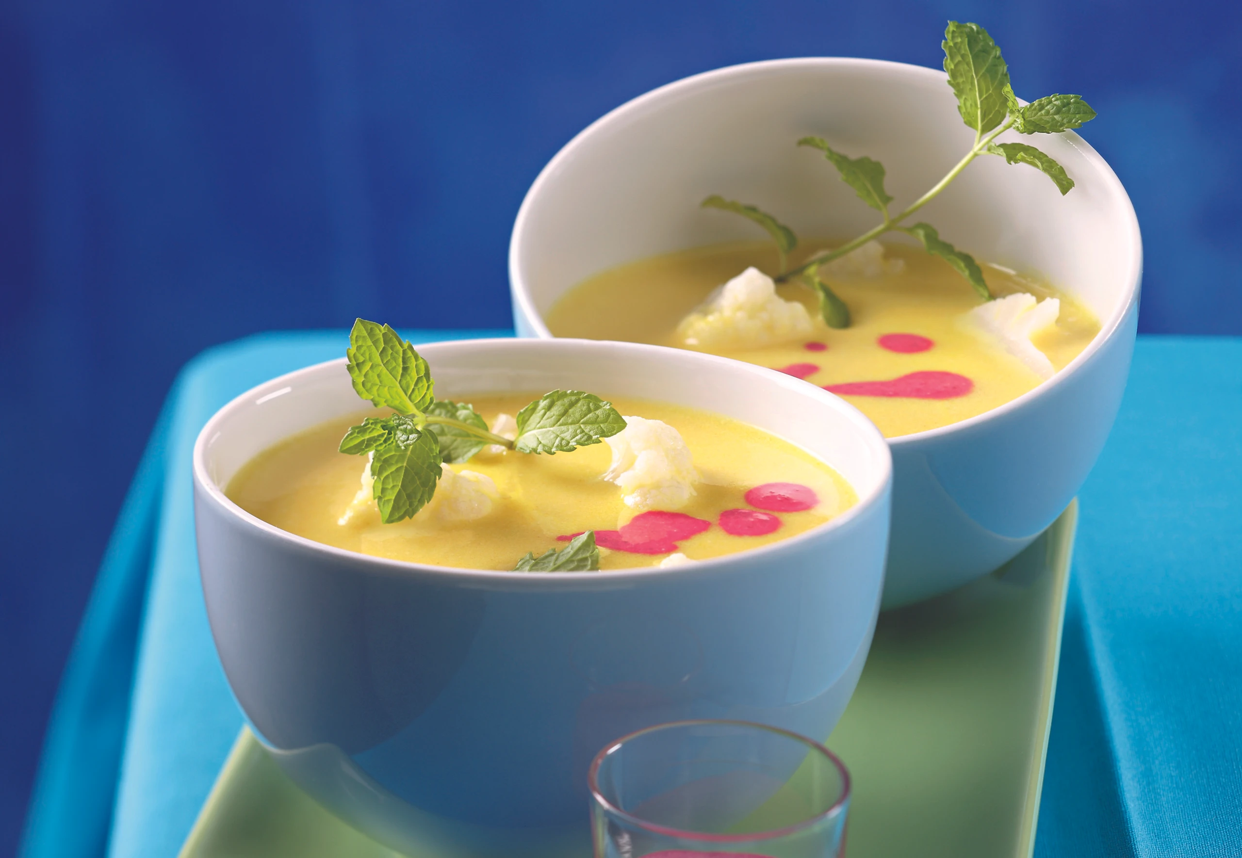 Suppe mit Creme fraiche und Zitronensaft fein pürieren. Übrige Karfiolröschen in die Suppe geben. Suppe mit Minze und Roter Rüben-Sauce garniert servieren.