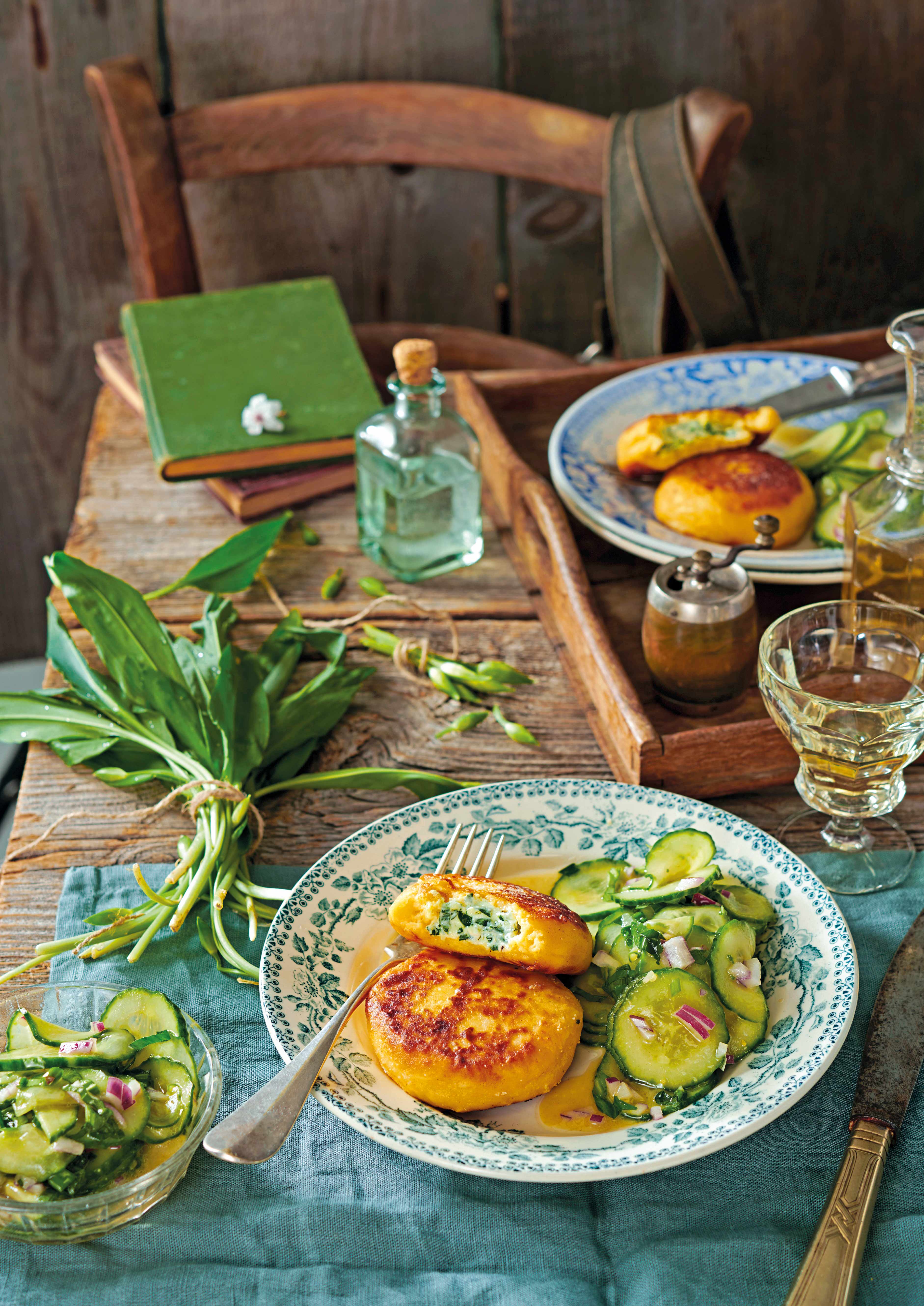 Für den Salat Gurke in dünne Scheiben raspeln. Zwiebel schälen und fein würfeln. Senf, Honig, Öl und Essig verrühren, mit Salz und Pfeffer würzen. Gurke, Zwiebel und Bärlauch untermischen. Datschi mit dem Gurkensalat anrichten.