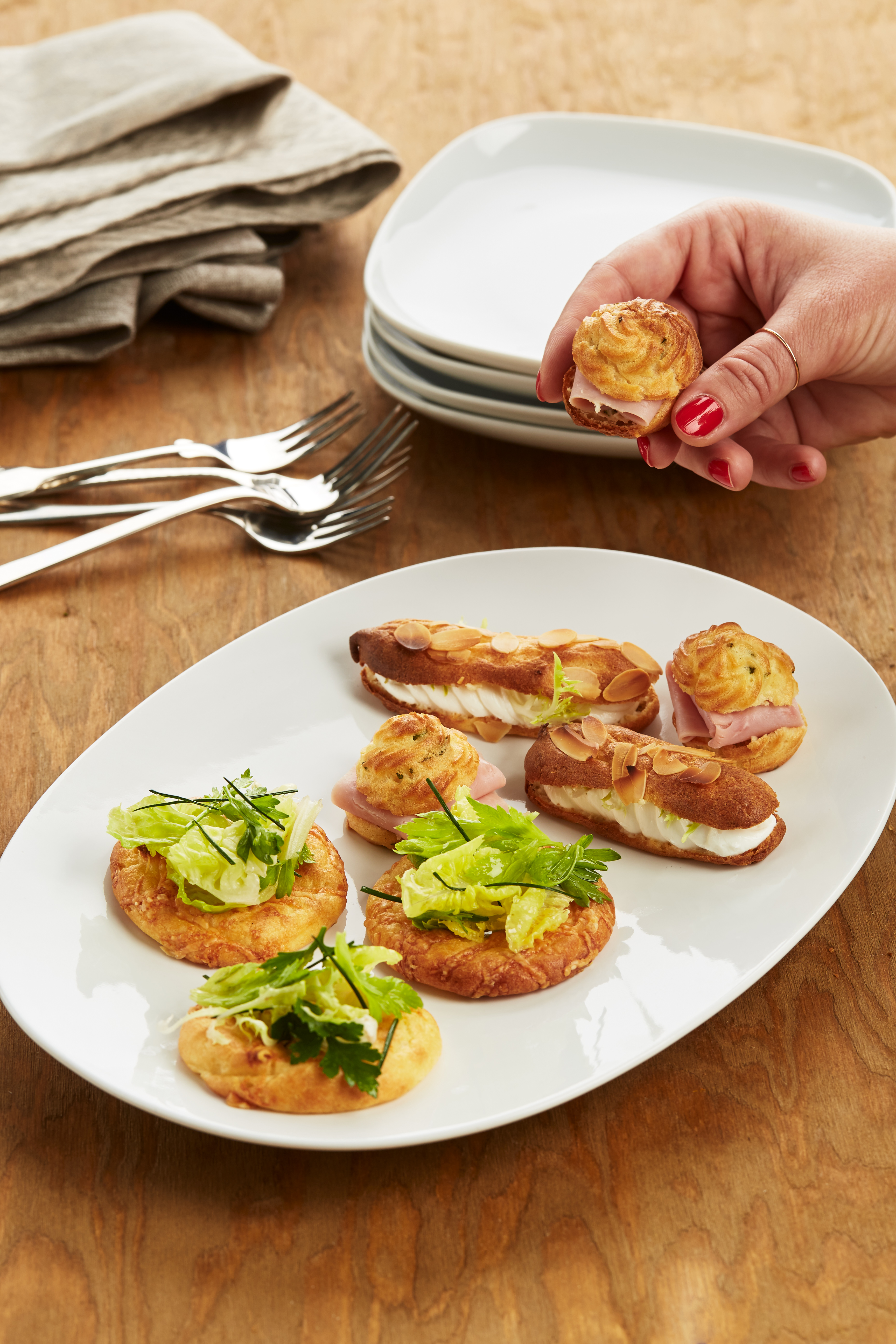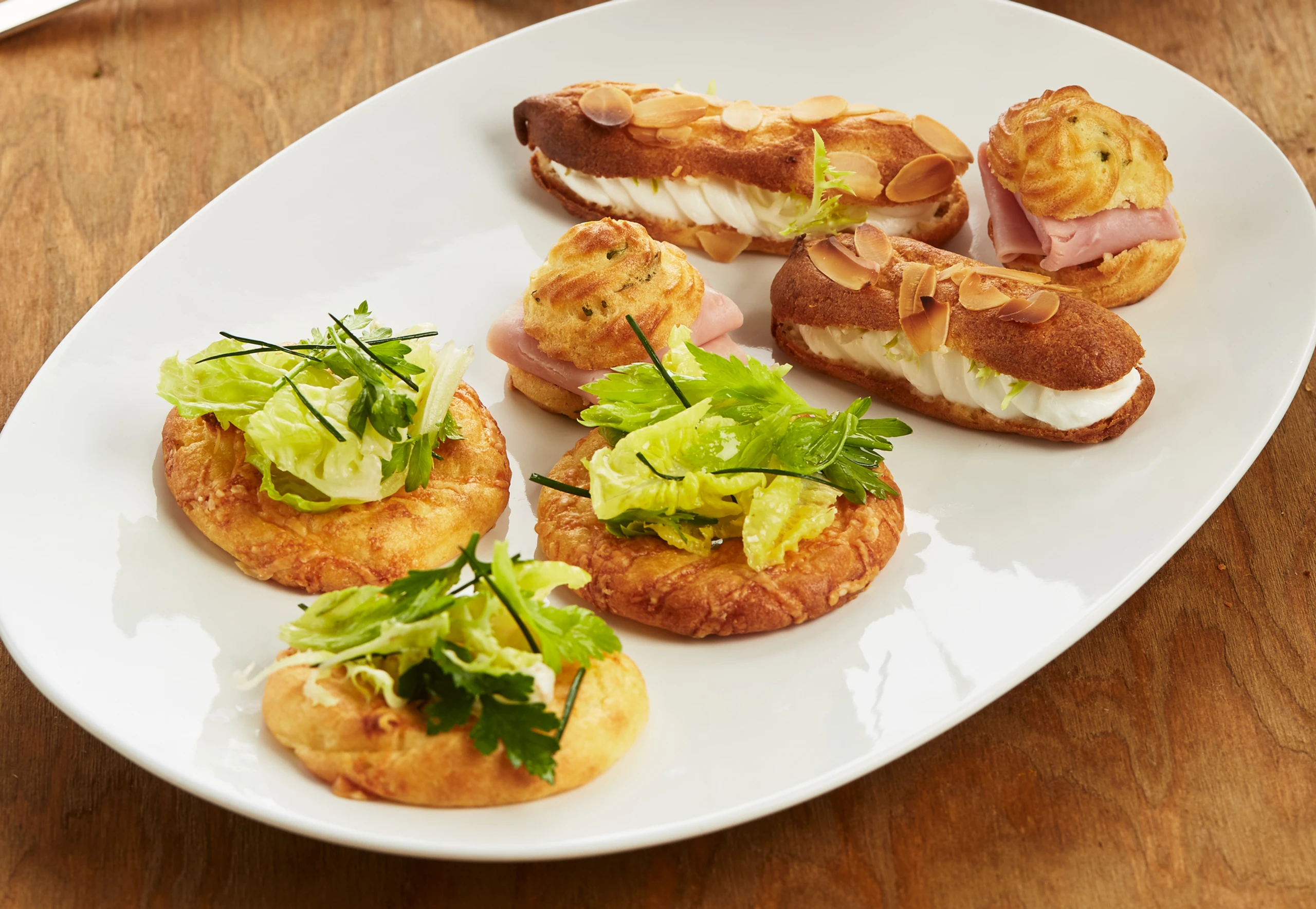 Stangerl und Krapferl horizontal durchschneiden. Stangerl mit Frischkäse, Krapferl mit Schinken füllen. Ringe mit Salat, Petersilie und Schnittlauch garnieren.