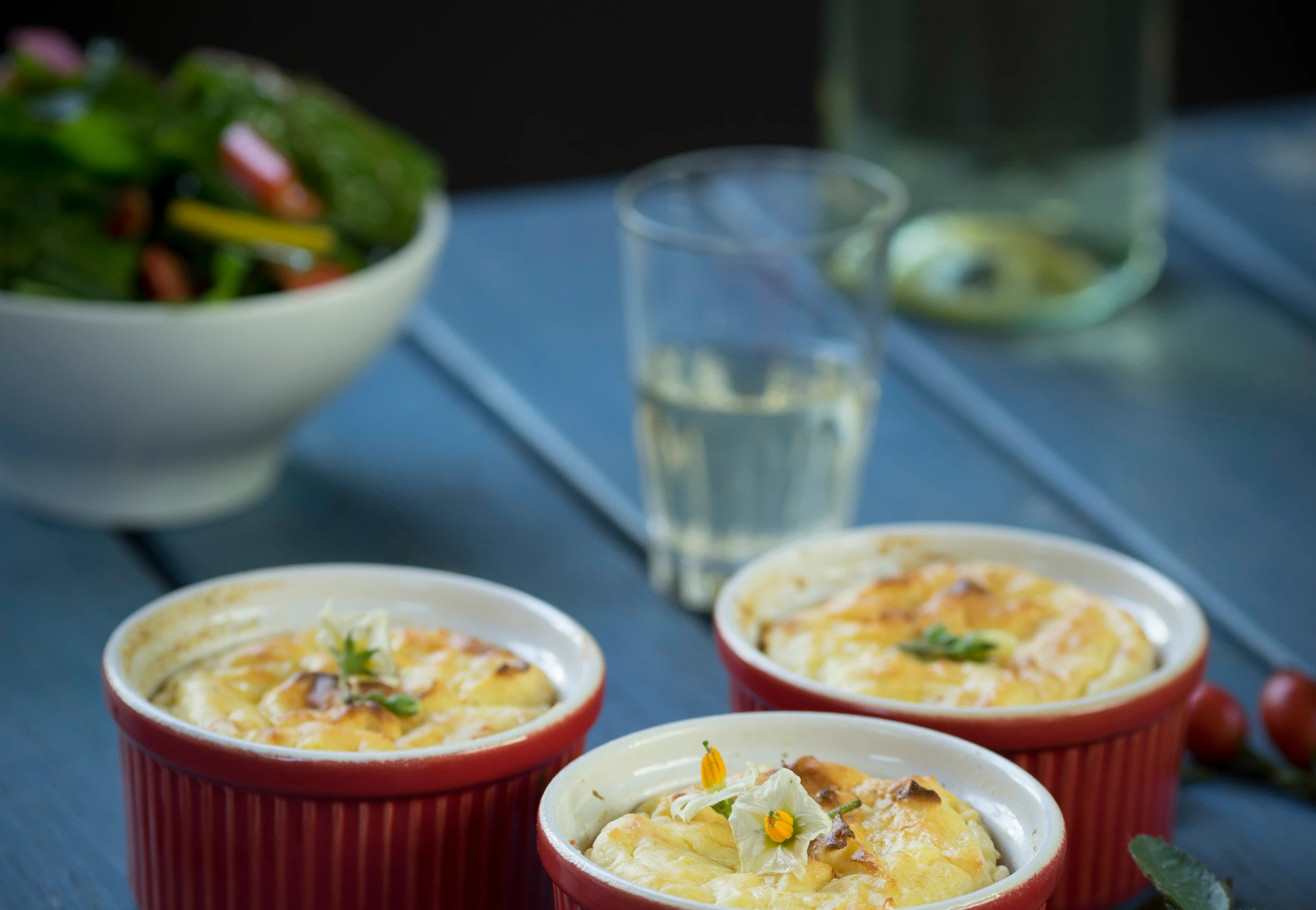 Erdäpfel schälen, in grobe Stücke schneiden und in Salzwasser weich kochen. Erdäpfel abseihen, passieren, mit Milch, Crème fraîche und Parmesan verrühren. Masse mit Salz, Pfeffer und Muskat würzen und kurz abkühlen lassen. Eier und Mehl unterrühren. Erdäpfelmasse in die Förmchen füllen und im Rohr (untere Schiene / Gitterrost) ca. 35 Minuten backen.