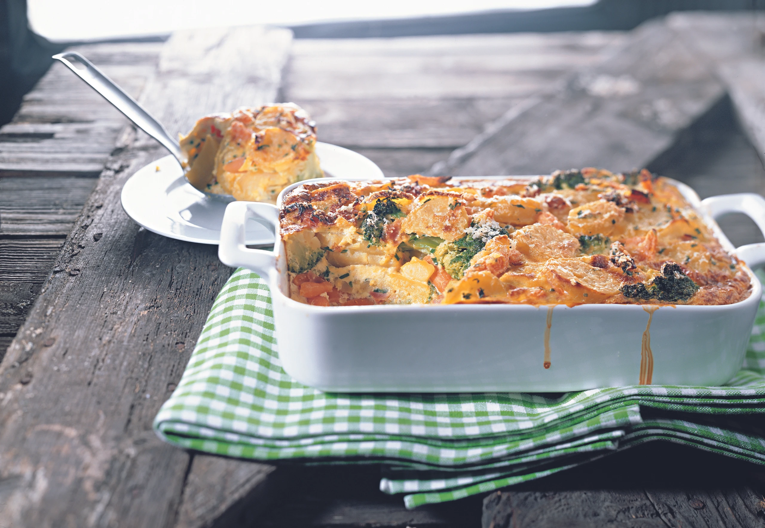 Rohr auf 180°C vorheizen. Auflaufform (ca. 18 x 26 cm) mit Butter ausstreichen und mit Bröseln ausstreuen. Gemüse in die Form füllen.