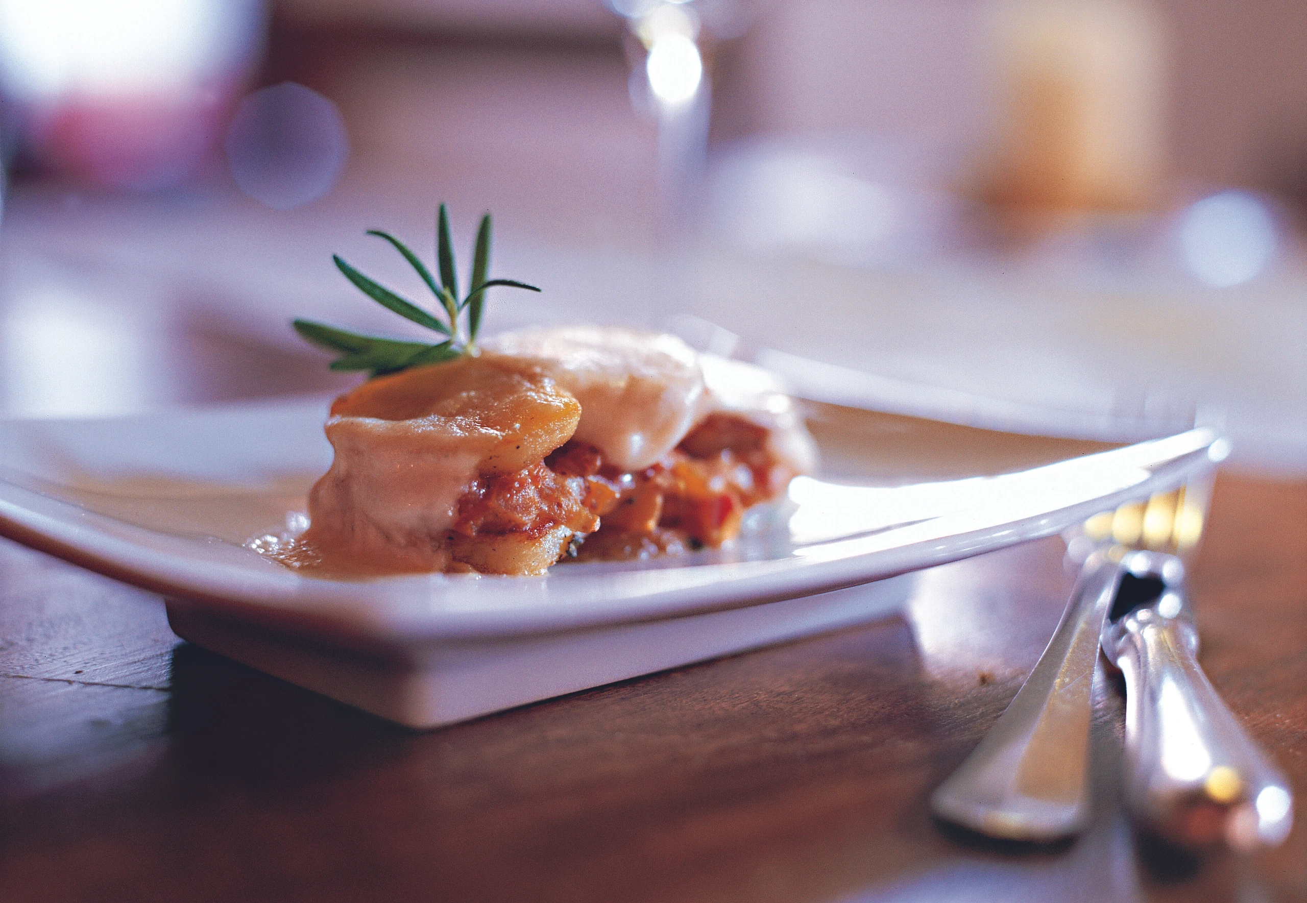 Eine Auflaufform mit Butter ausstreichen. Erdäpfel in Scheiben schneiden und lagenweise in die Form schichten, jede Schicht mit Senfragout bestreichen.
