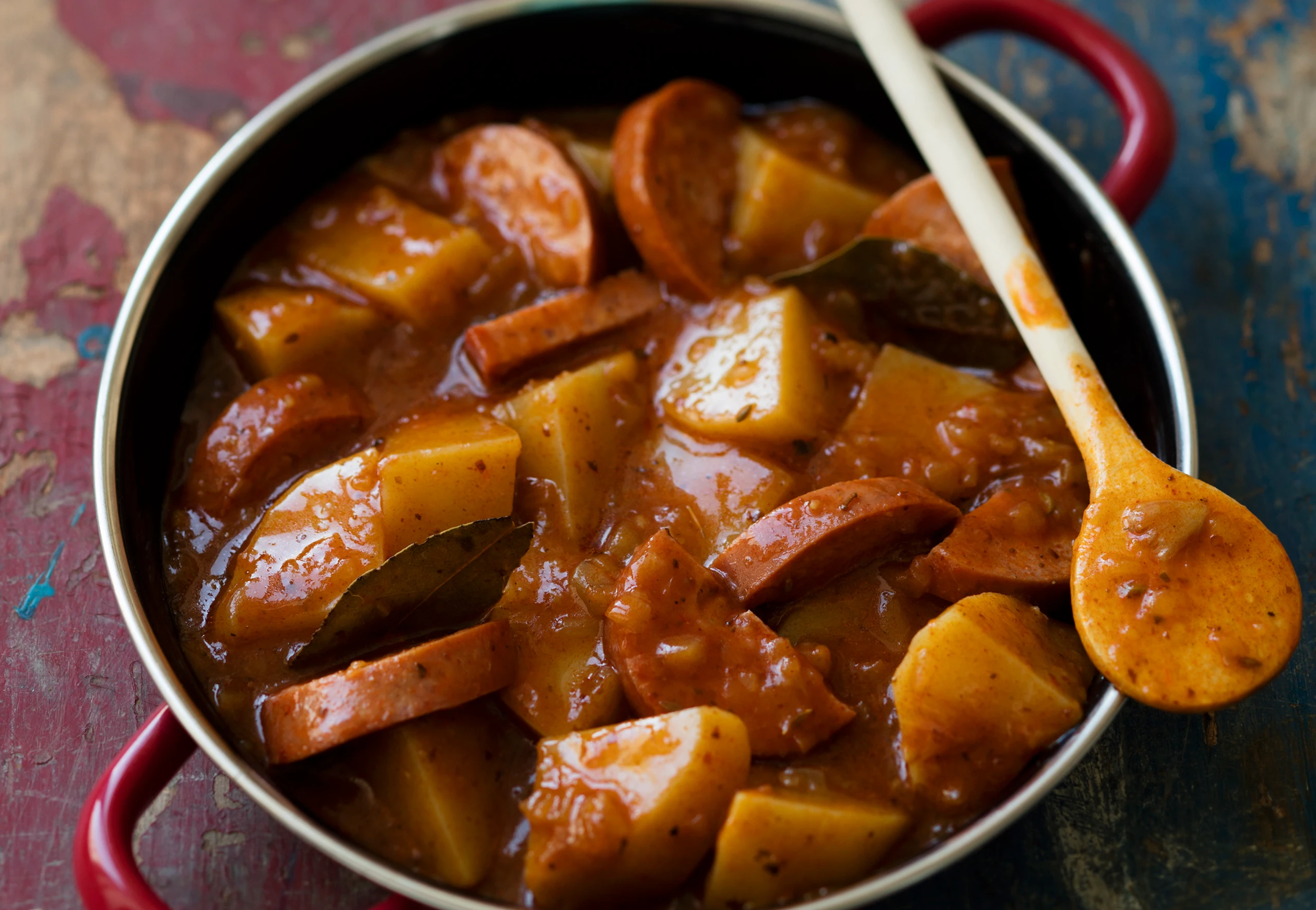 Gegen Ende der Garzeit Stärke mit 2 EL Wasser mischen, in das Gulasch rühren und kurz köcheln. Lorbeer entfernen, Wurst zugeben und mitgaren.
