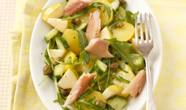 Erdäpfel-Gurken-Birnensalat mit Räucherforelle