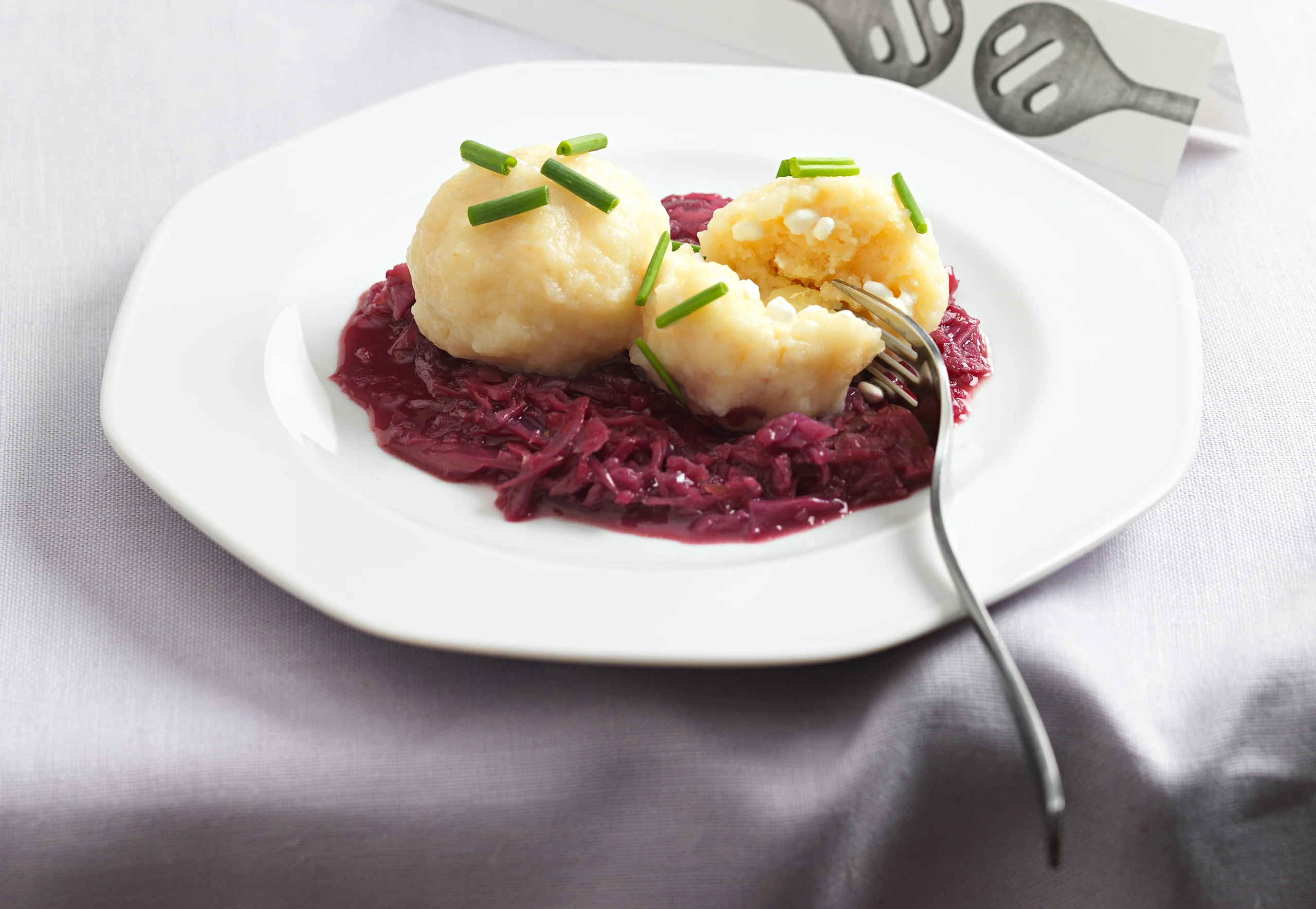 Typisch Oberösterreich: Erdäpfel-Käse-Knödel auf Blaukraut