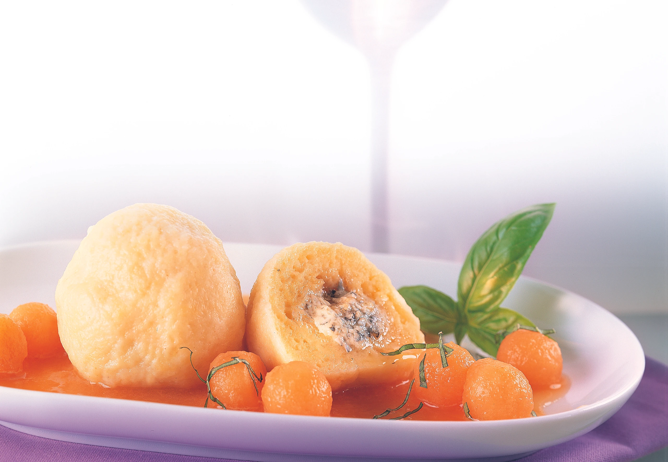 Erdäpfel-Käse-Knödel mit Melonenragout
