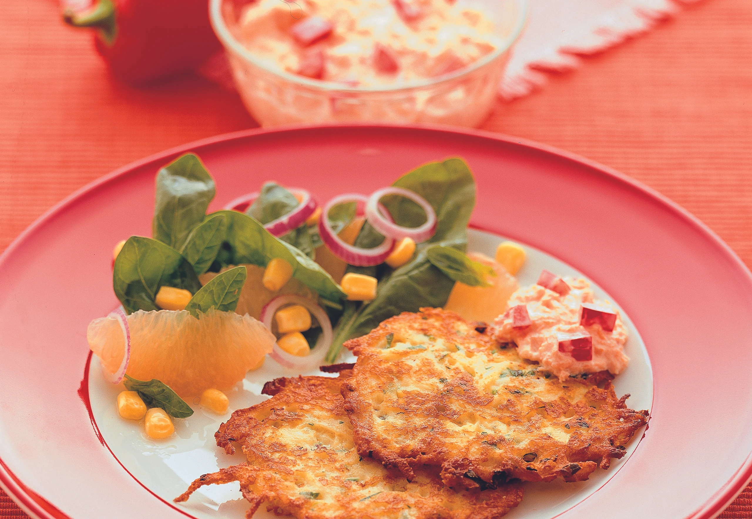 Erdäpfel-Käse-Knusperli, dazu Spinat mit Grapefruit und Karotten-Joghurt-Sauce