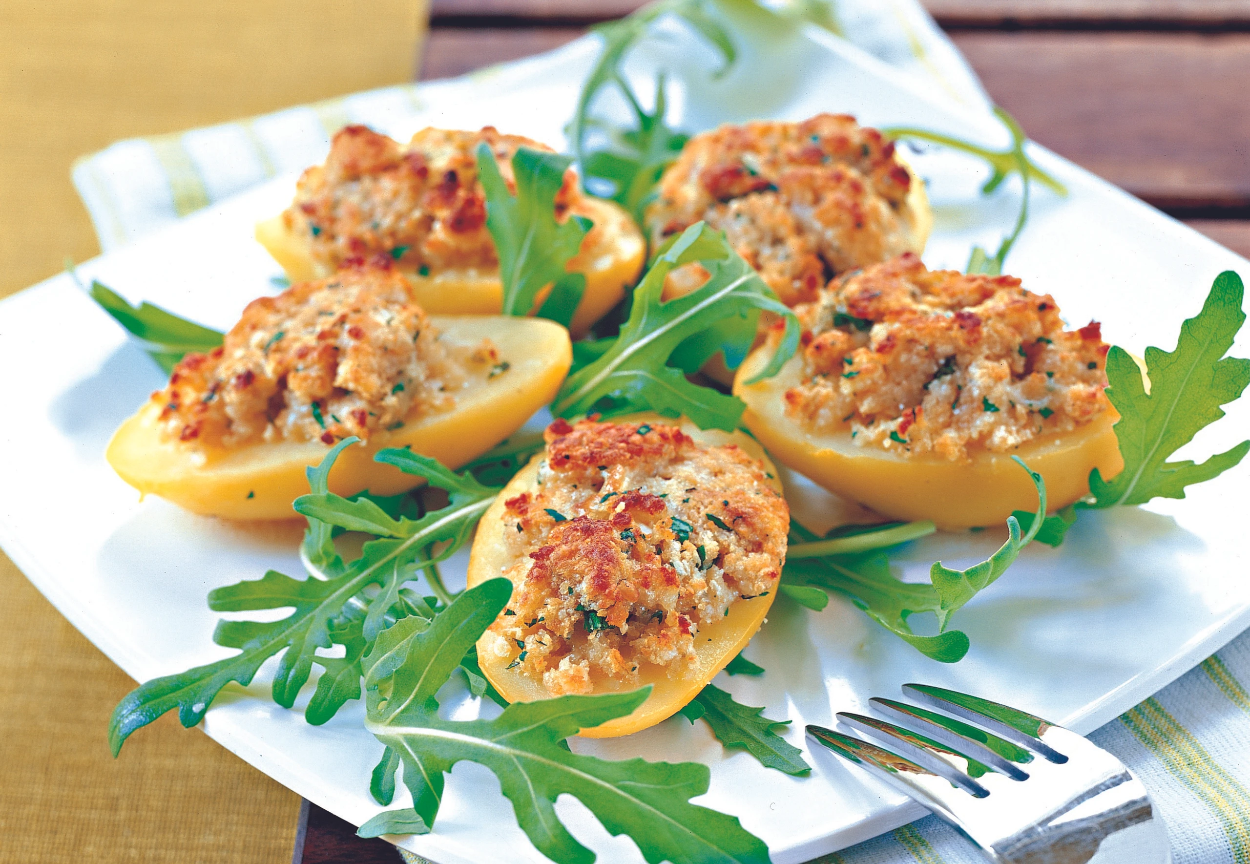 Erdäpfel längs halbieren, Hälften am Boden ein wenig abflachen. Käsemasse auf den Erdäpfelhälften verteilen. Erdäpfel auf das Blech setzen und im Rohr (mittlere Schiene) überbacken (ca. 20 Minuten). Erdäpfel mit Rucola garniert servieren.