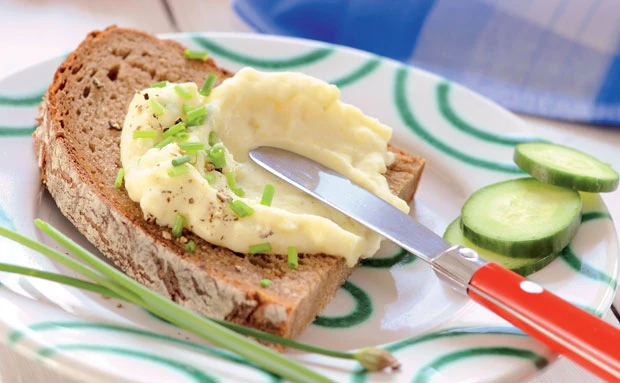 Erdäpfel mit Sauerrahm verrühren (Gabel), Knoblauch und Zwiebel untermischen. Erdäpfelkas mit Salz und Pfeffer abschmecken.
