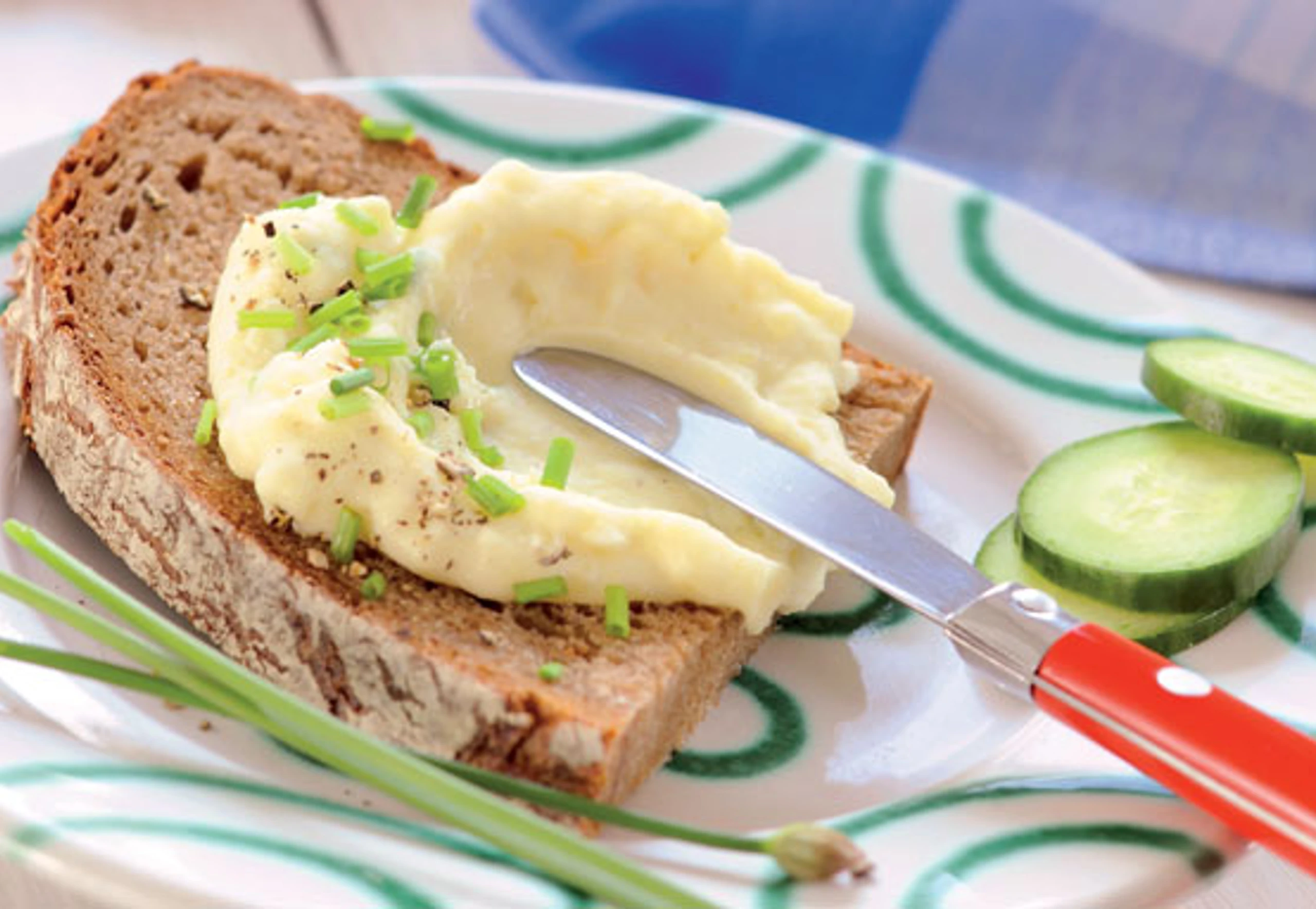 Brote mit Kas bestreichen, mit Schnittlauch und Gurke garnieren.