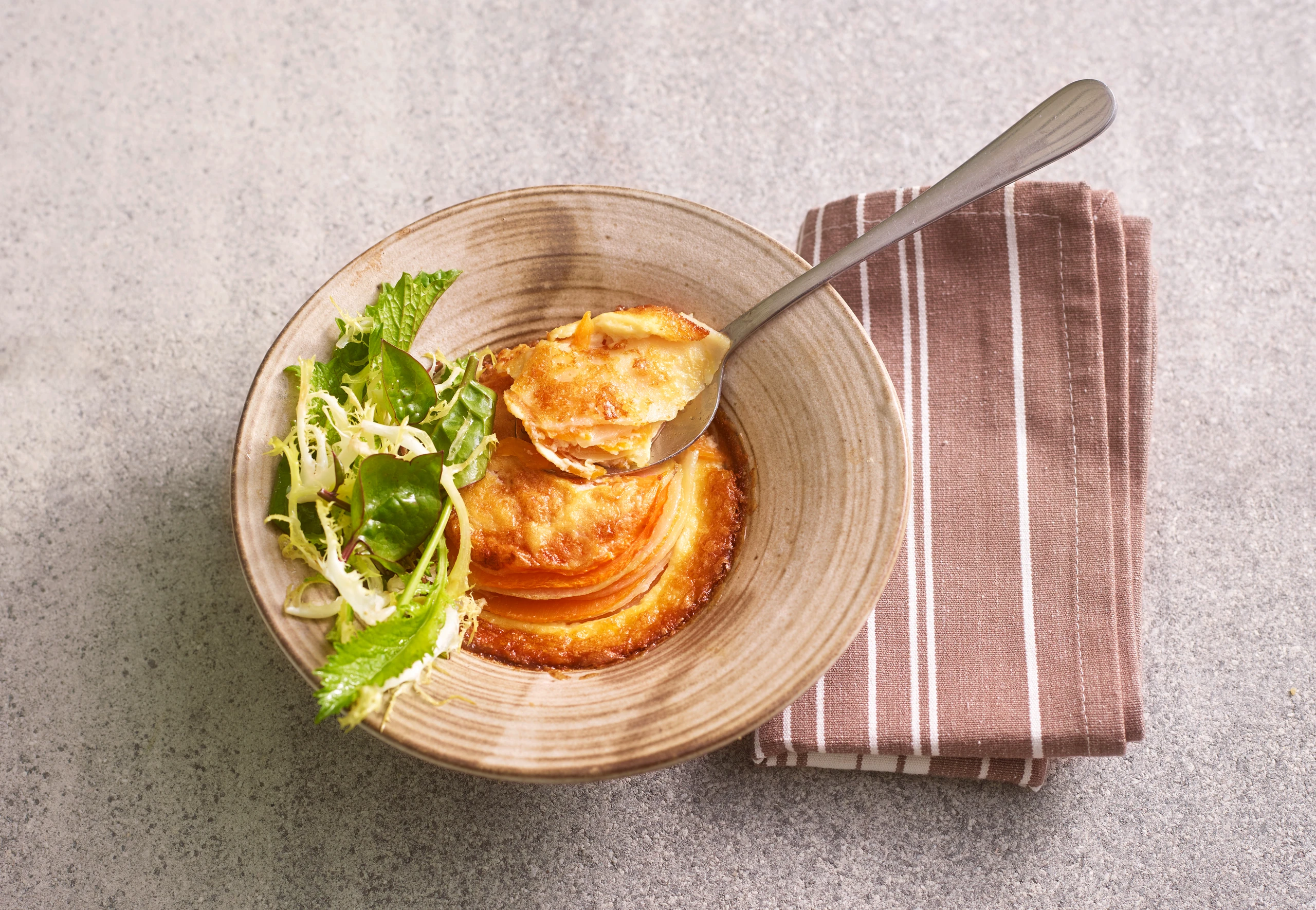 Erdäpfel und Kürbis schälen, in ca. 3 mm dicke Scheiben schneiden (Brotschneidemaschine) und mit Salz und Pfeffer würzen.