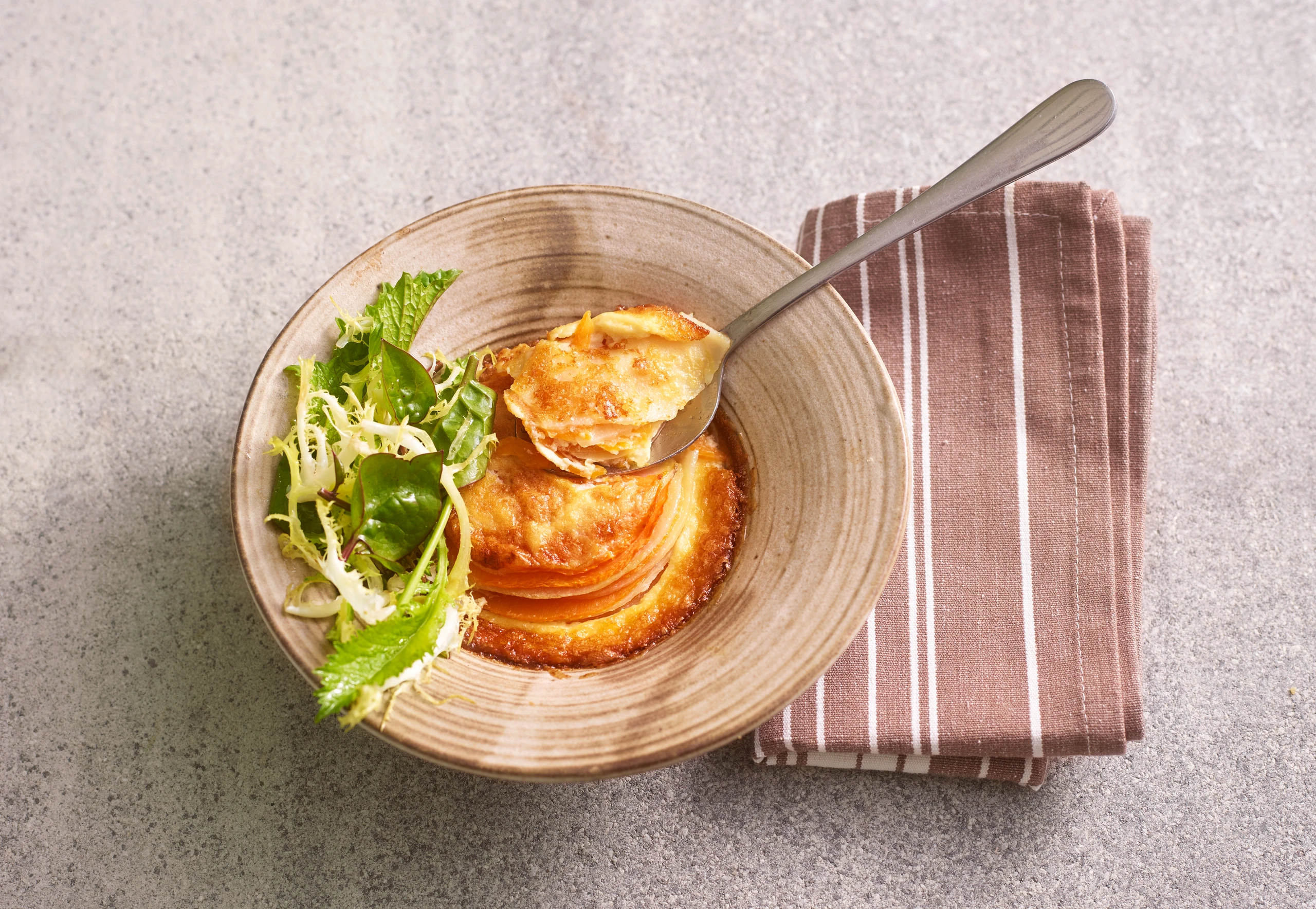Erdäpfel- und Kürbisscheiben abwechselnd in die Form schichten und mit der Käsemischung gut bedeckt aufgießen. Auflauf im Rohr (untere Schiene / Gitterrost) ca. 1 Stunde backen.