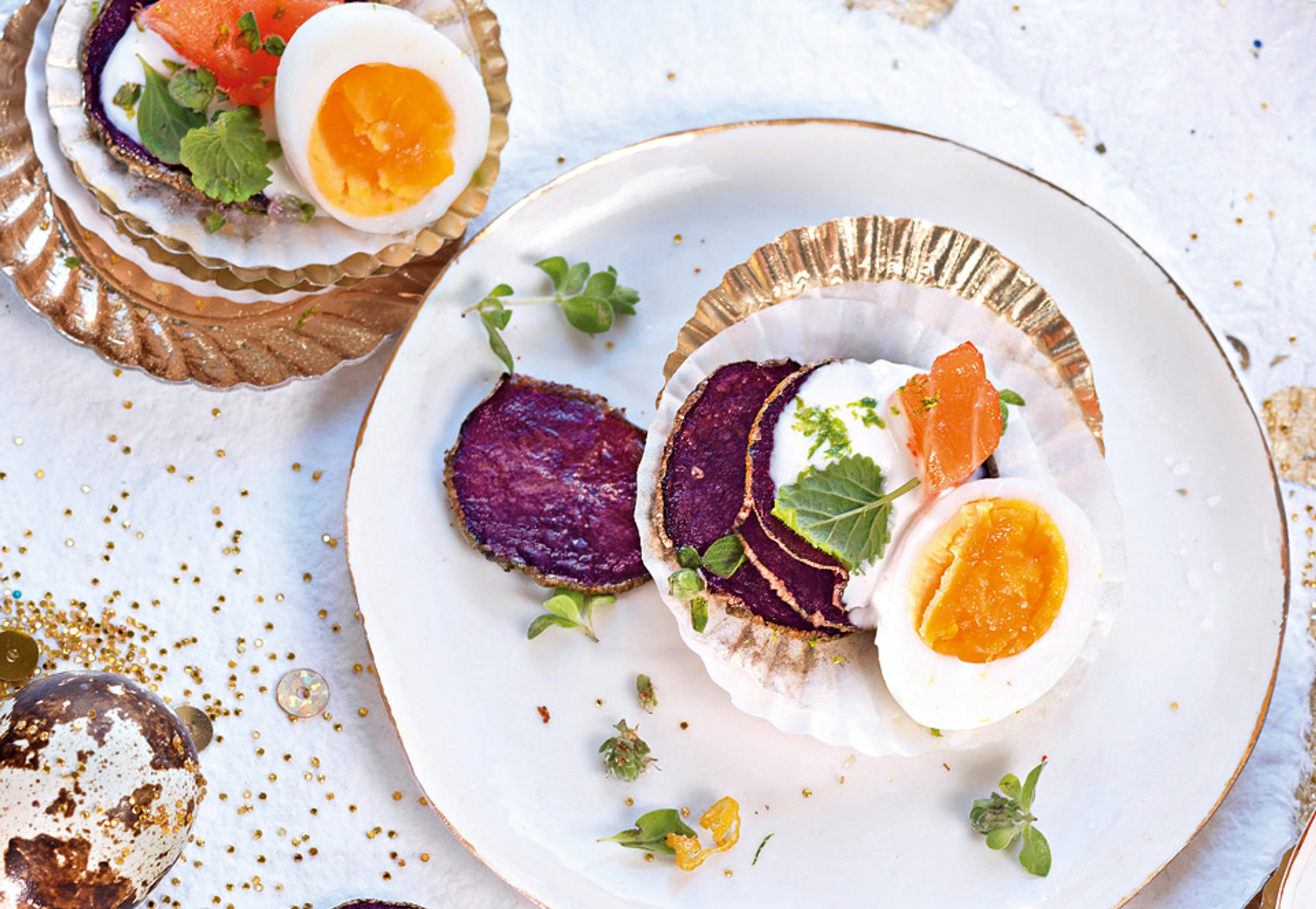 - Lachs in 12 Würfel schneiden. 2?3 Erdäpfelscheiben übereinanderlegen, mit einem Klecks Limettenrahm, einem Lachswürfel und einem halben Wachtelei anrichten, mit Oreganoblättchen und Limettenzesten garnieren.