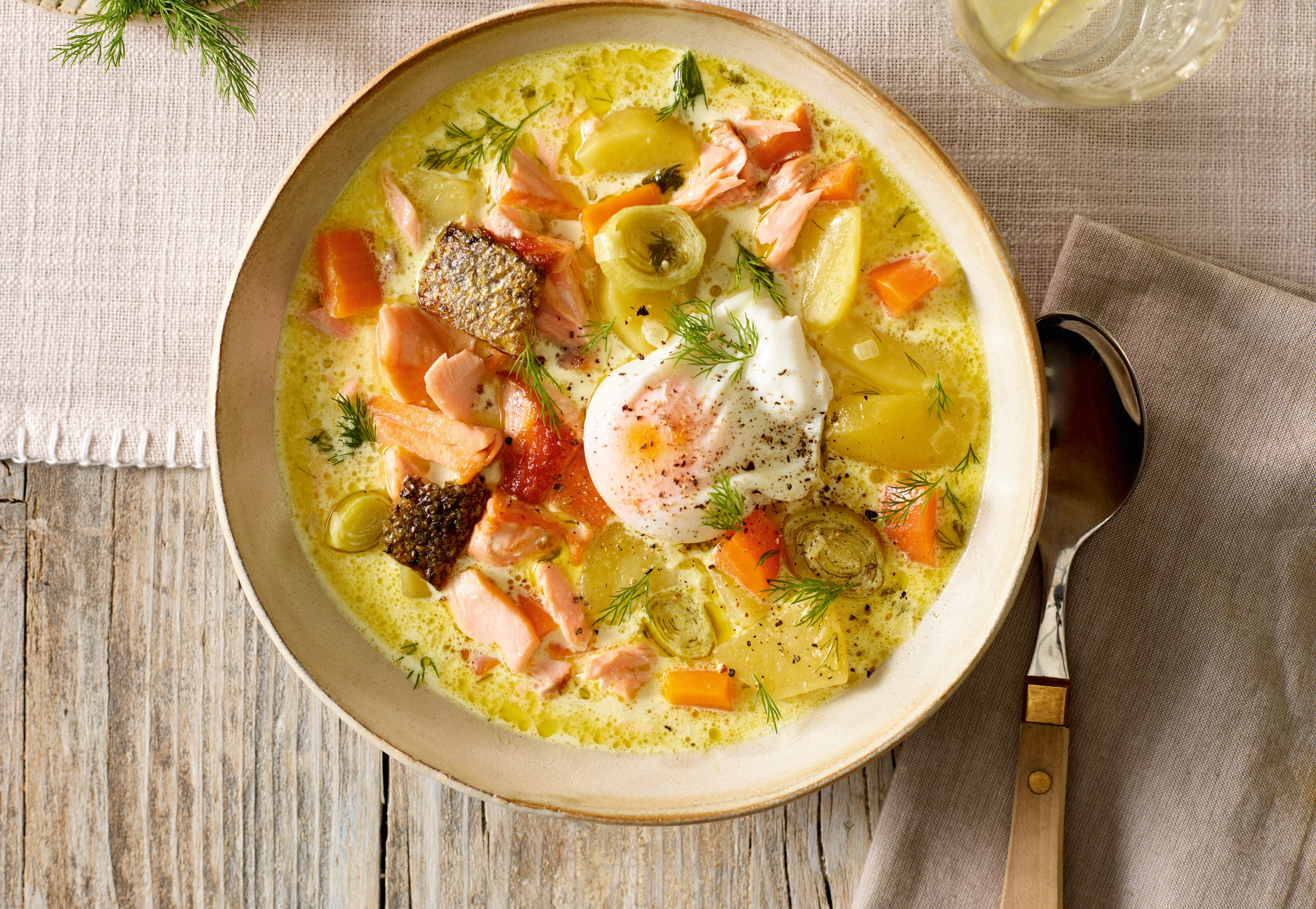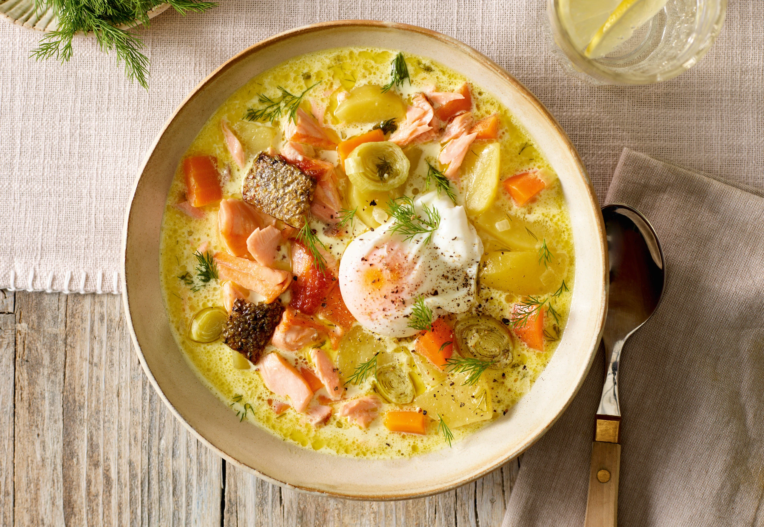 Erdäpfel-Lachs-Suppe mit pochiertem Ei