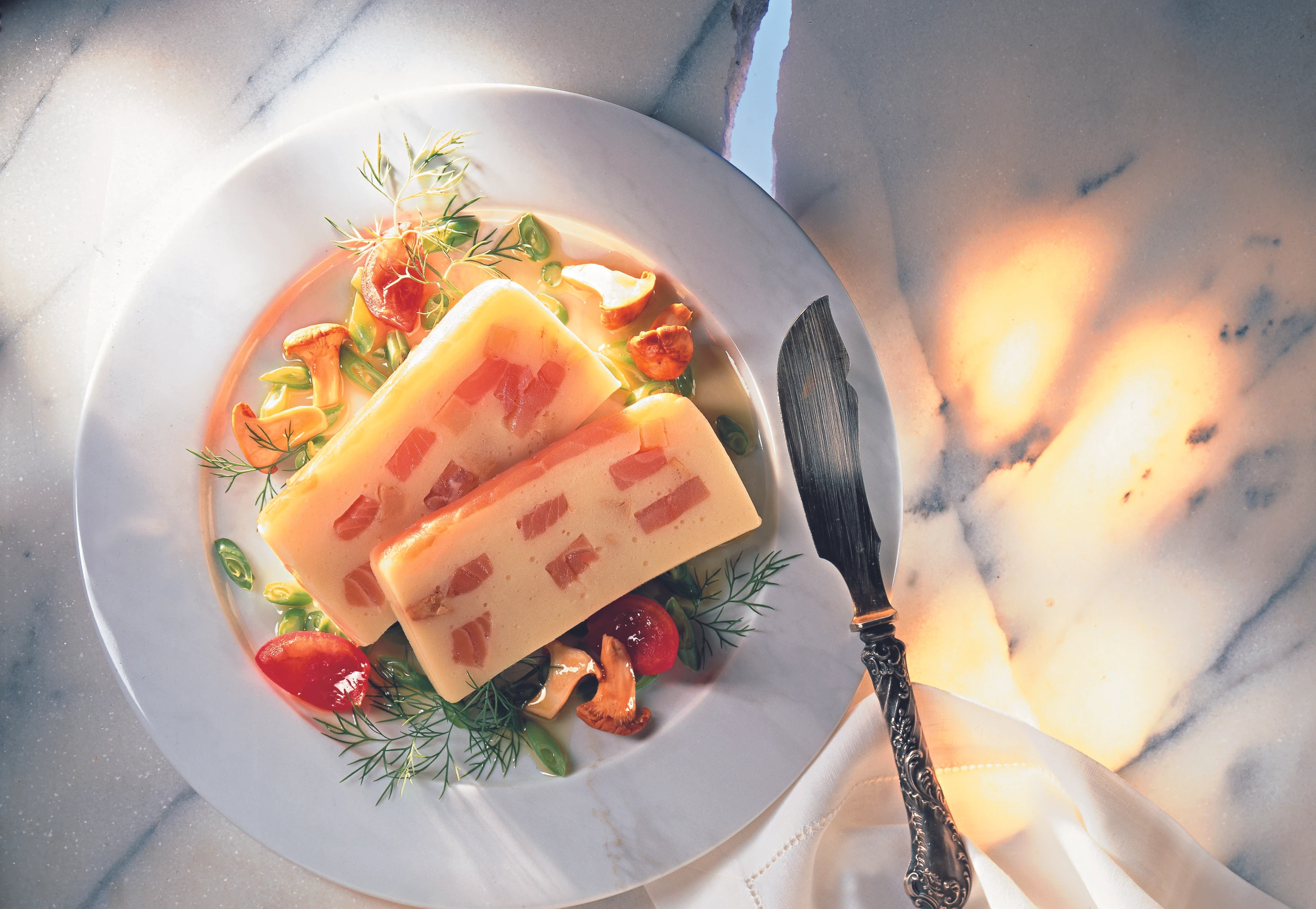 Mehlige Erdäpfel schälen, noch heiß durch eine Erdäpfelpresse drücken, mit Salz und abgeriebener Muskatnuß würzen und mit der Milch verrühren. 5Gelatine in kaltem Wasser einweichen, ein wenig ausdrücken, in einem Topf auf kleiner Flamme schmelzen und zügig in die Erdäpfelmasse rühren. Masse ein wenig auskühlen lassen – sie darf allerdings nicht festwerden. 6Erdäpfelwürfel unterziehen. Das Obers schlagen und unterheben. Ein Drittel der Masse in die Form füllen und mit der Hälfte der Lachsstreifen belegen. Zweites Drittel der Masse darauf verstreichen, mit den übrigen Lachsstreifen belegen und mit restlicher Erdäpfelmasse abschließen. Terrine mit Frischhaltefolie zudecken und zum Festwerden kühlstellen (mindestens 5 Stunden). 7Terrine aus der Form stürzen, Folie abziehen. Terrine in nicht zu dünne Scheiben schneiden und mit Schwammerl-Fisolen-Salat (siehe Rezept) anrichten.