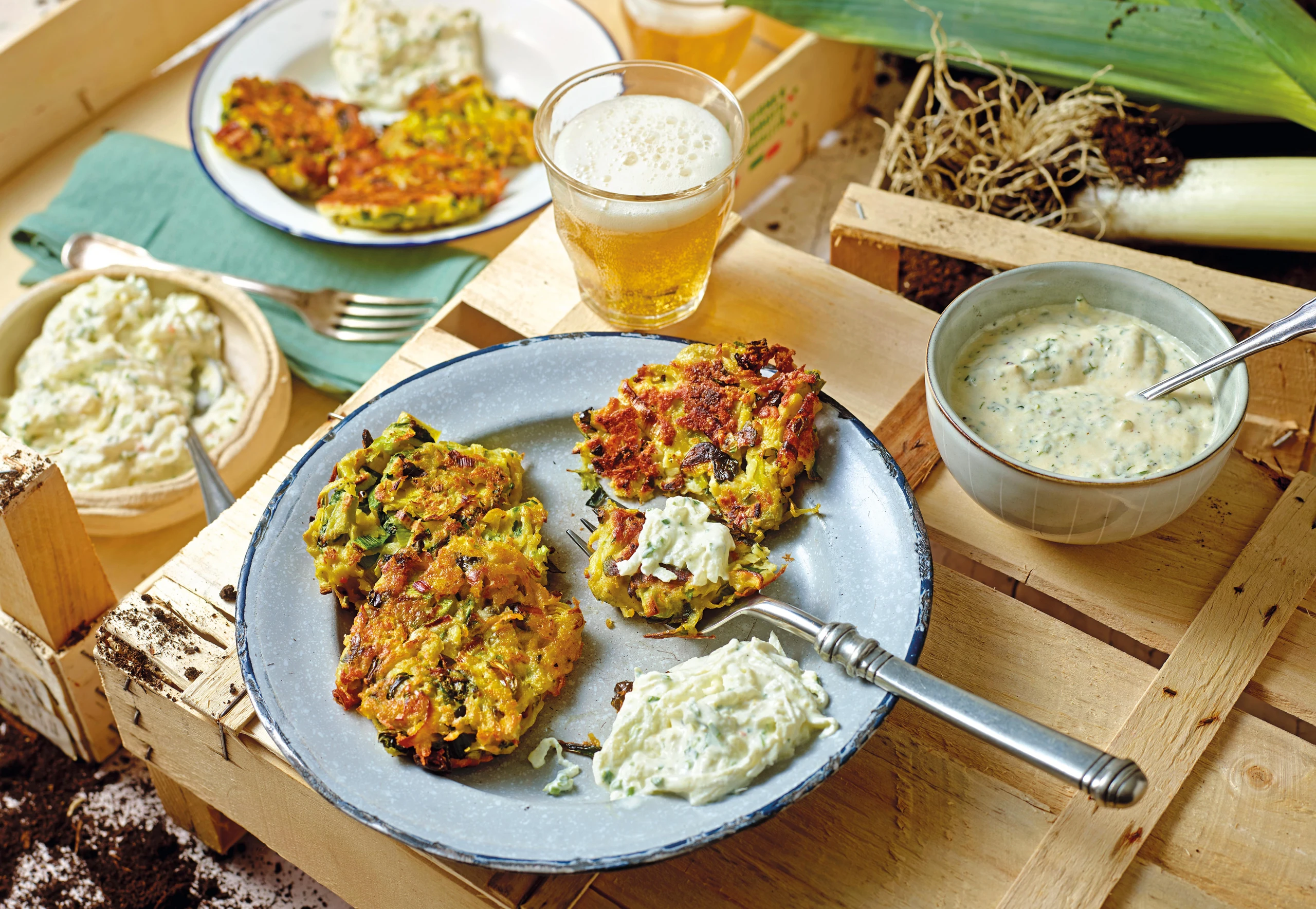 Erdäpfel-Lauchpuffer mit Gorgonzola und Kresse-Apfelmayonnaise