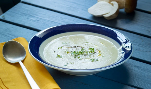 - Thymianzweige herausnehmen, Suppe fein pürieren, salzen, pfeffern und anrichten. Suppe mit je 1 EL Steinpilzöl beträufeln, mit Pilzen bestreuen und mit Thymian garnieren.