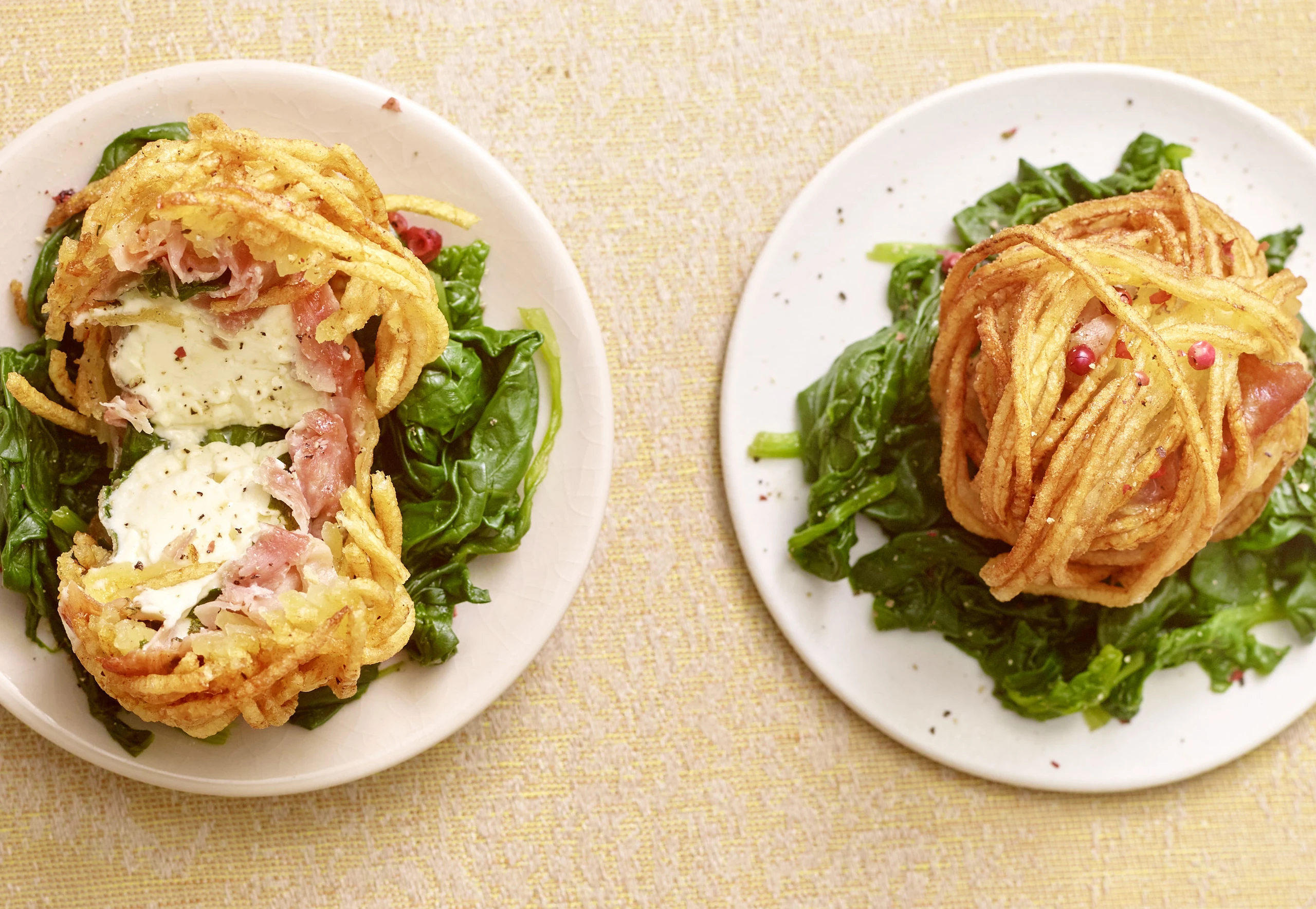 - Für die Garnitur vom Spinat grobe Stiele entfernen. Pfanne erhitzen, Spinat darin zusammenfallen lassen. Erdäpfel-Packerl auf den Spinat setzen, mit Rosa Beeren und frisch gemahlenem Pfeffer bestreuen.