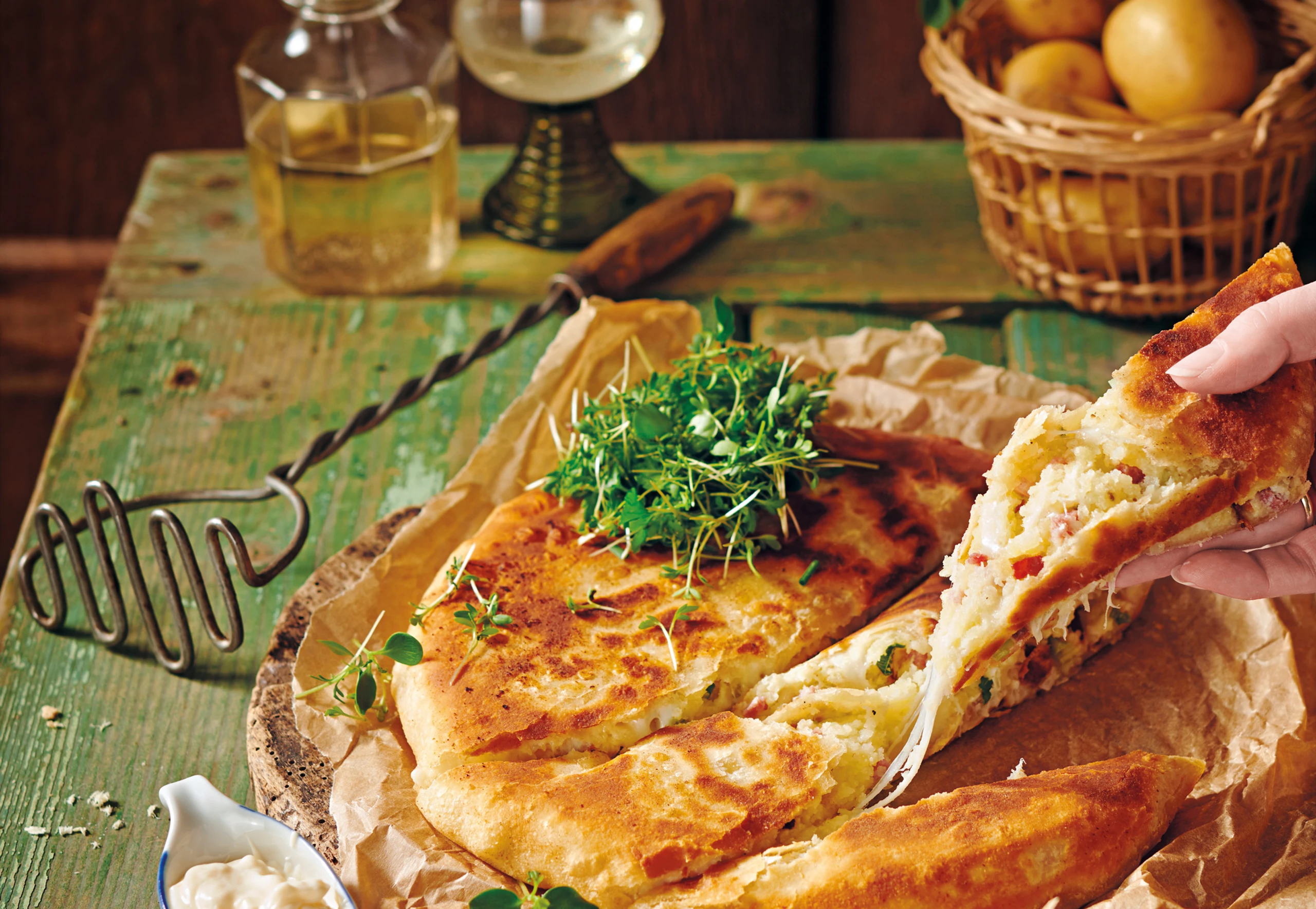 Teig auf einer bemehlten Arbeitsfläche dünn und rund ausrollen. Die Hälfte vom Käse mittig auf dem Teig verteilen; dabei ca. 5 cm vom Rand aussparen. Erdäpfelmasse darauf verteilen und mit übrigem Käse bestreuen; Rand frei lassen. Teig über die Fülle zur Mitte hineinschlagen und behutsam zusammendrücken. Der Pancake soll keine Löcher haben. Mit Mehl stauben und vorsichtig ausrollen, bis der Pancake ca. 3 cm hoch ist.