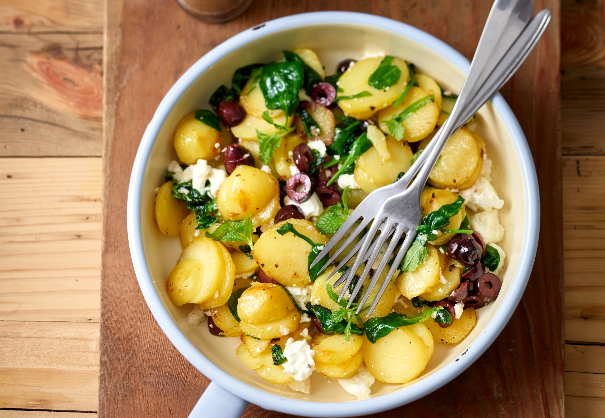 Erdäpfel-Pfanne mit Spinat, Feta und Chili
