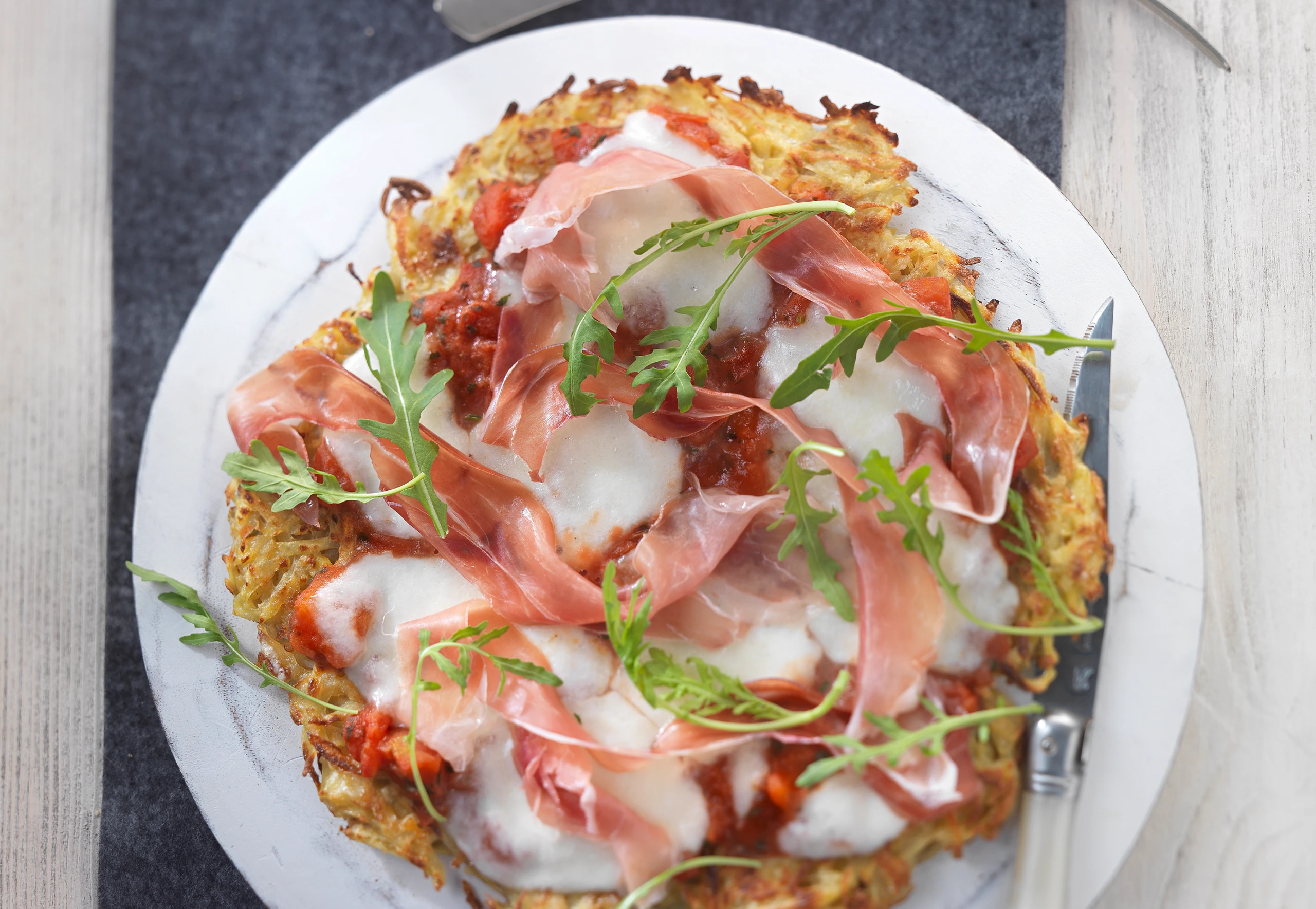 Erdäpfelmasse mit Pulpe bestreichen, mit Mozzarella belegen und im Rohr (obere Schiene / Gitterrost) ca. 1 Minute überbacken. Pizza mit Rohschinken belegen und mit Rucola bestreut servieren.