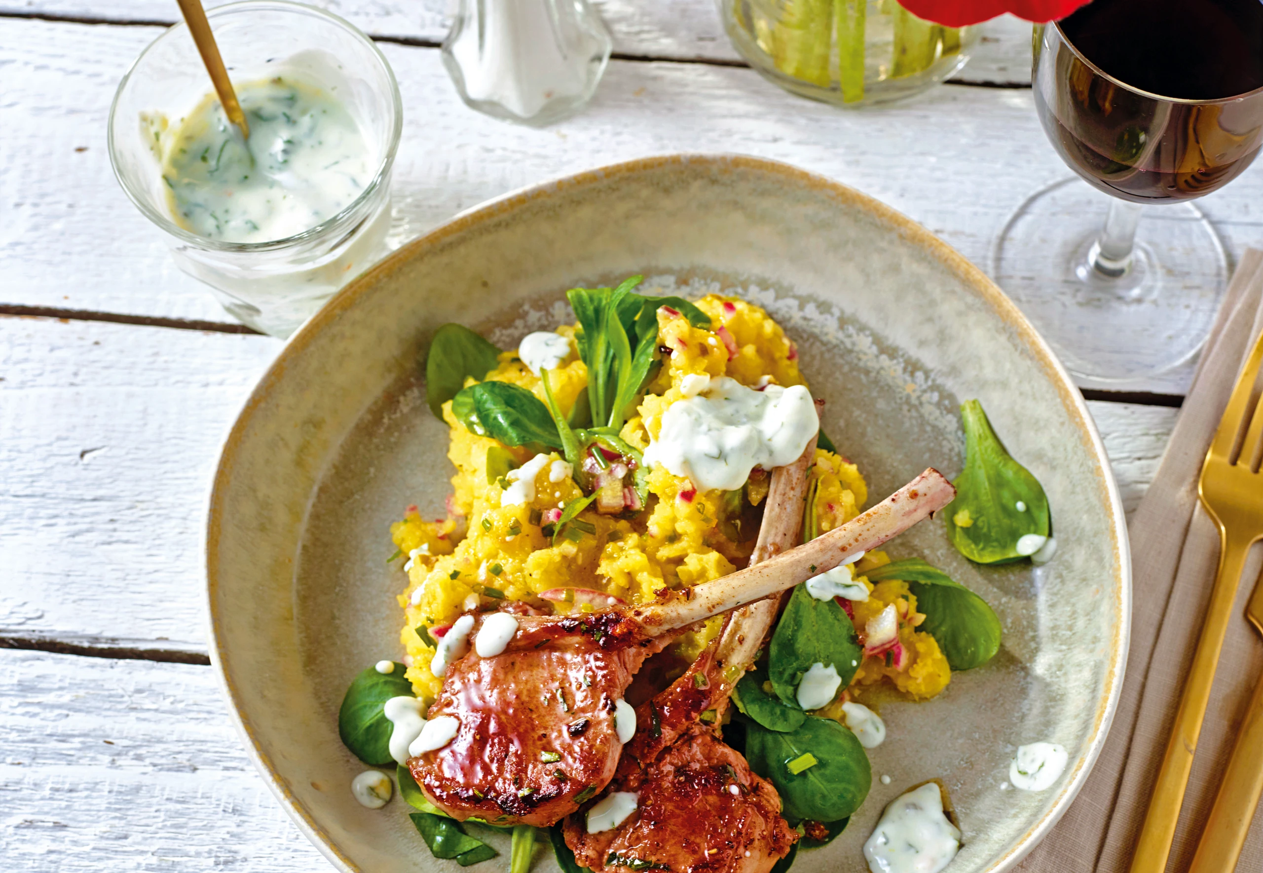 ErdäpfelSalattatar mit Vogerlsalat anrichten. Darauf die Koteletts setzen und mit der Sauce garnieren.
