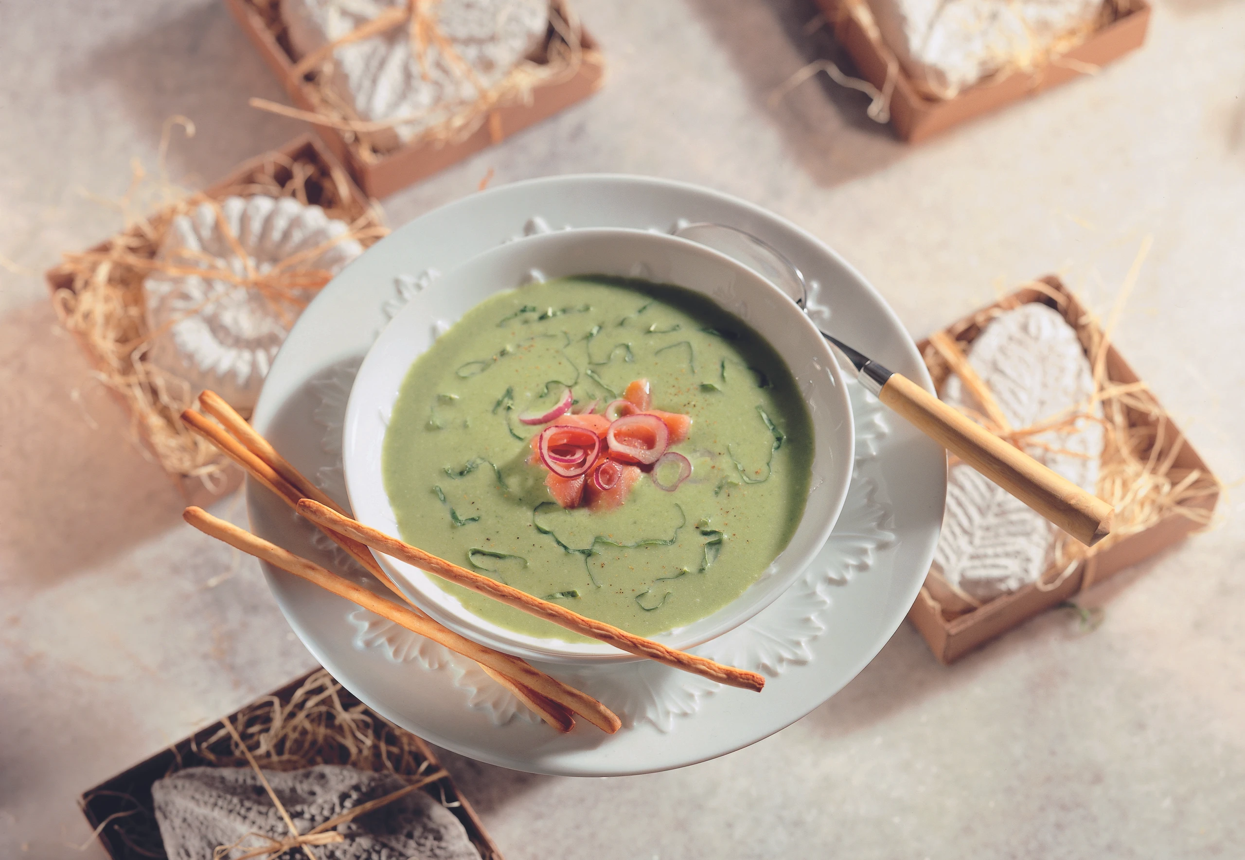 Suppe in vorgewärmte Teller schöpfen und mit Zwiebelringen, Lachs und Sauerampferstreifen garniert servieren. Dazu passen Grissini.