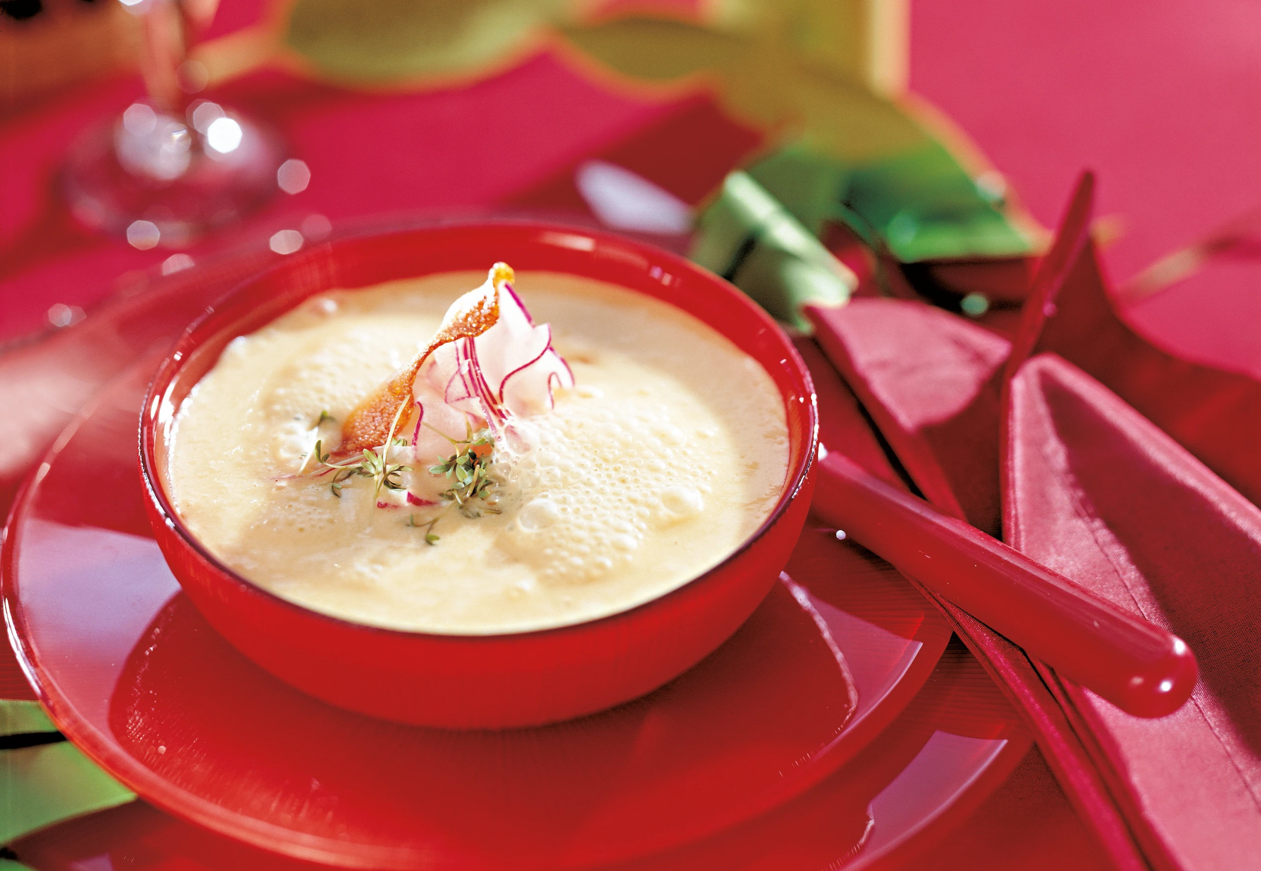 Suppe nochmals aufmixen, mit Radieschenscheiben, Erdäpfelchips und Kresse garniert servieren.